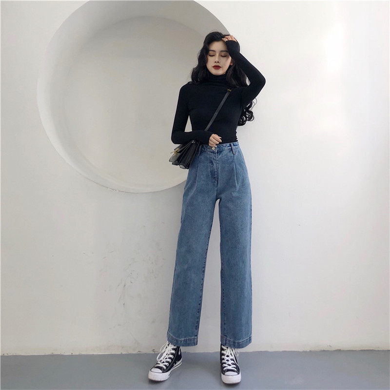 復古韓國百搭chic風高腰顯瘦直筒褲牛仔褲女寬松簡約長褲潮可卷邊