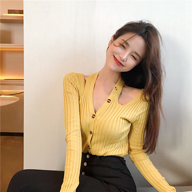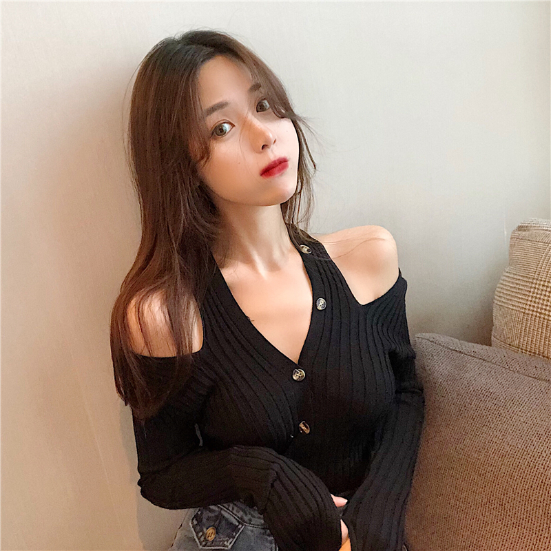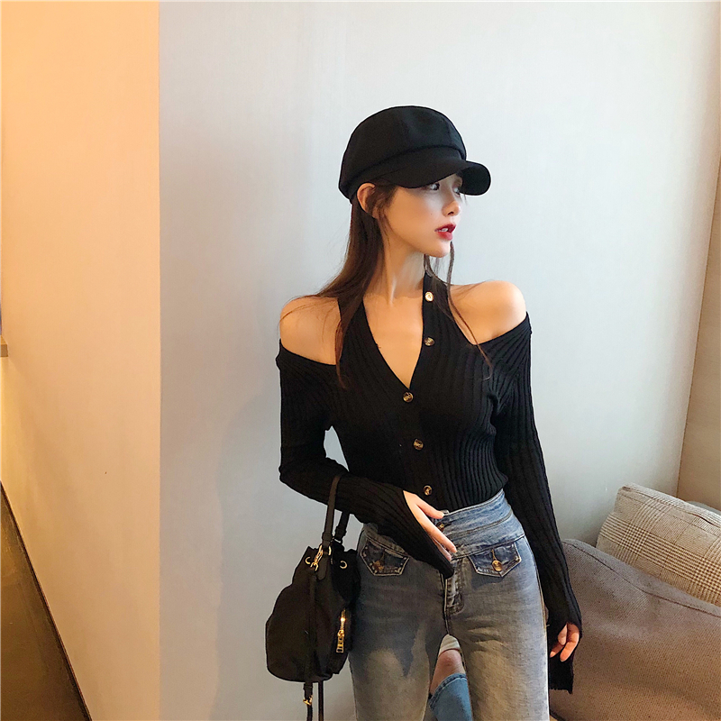 chic早秋毛衣慵懶風網紅同款性感氣質小心機鏤空露肩長袖針織衫女