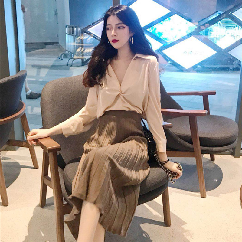 / 時尚套裝女秋季新款設計感V領長袖襯衫上衣+高腰針織百褶半身裙子