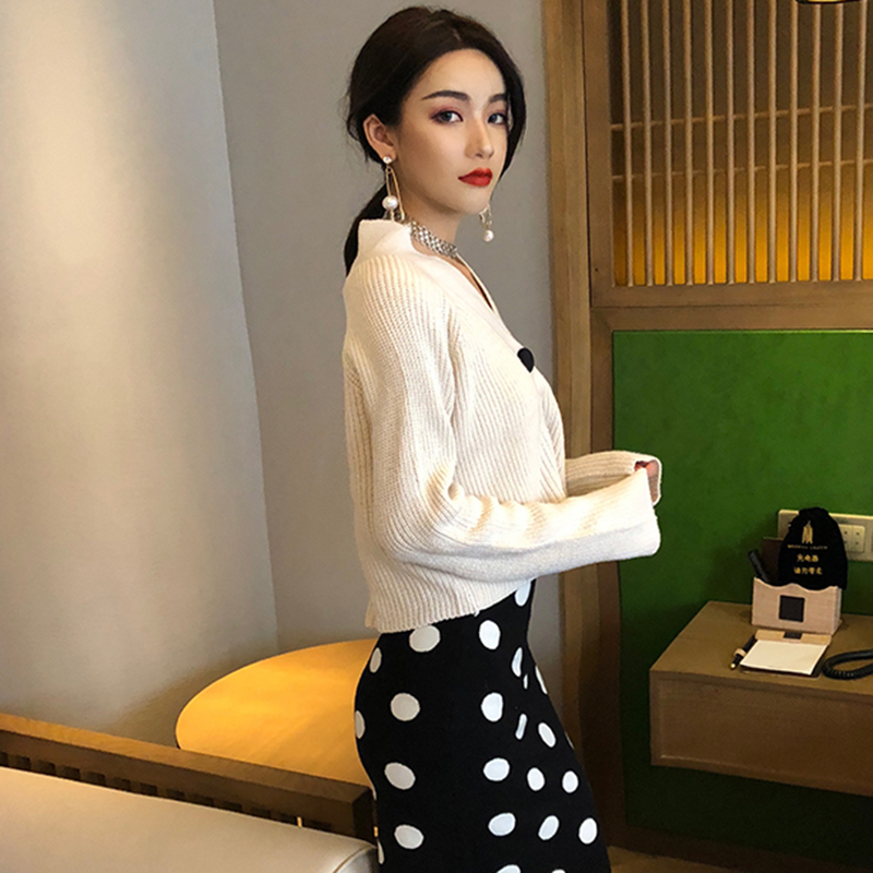 慵懶風V領長袖針織開衫女秋冬裝新款寬松短外套學生時尚黑色上衣
