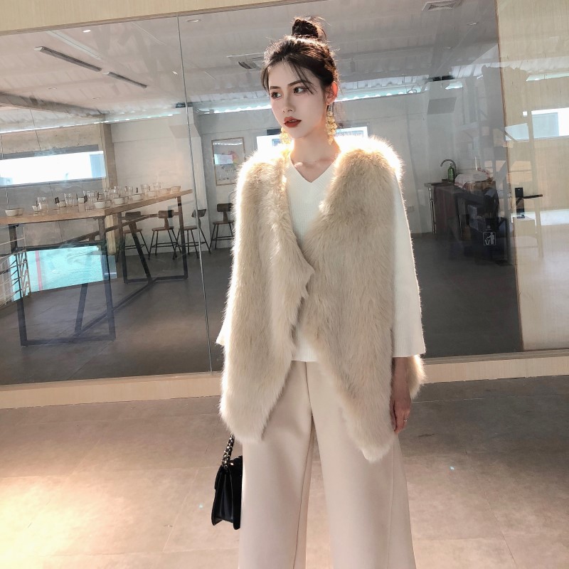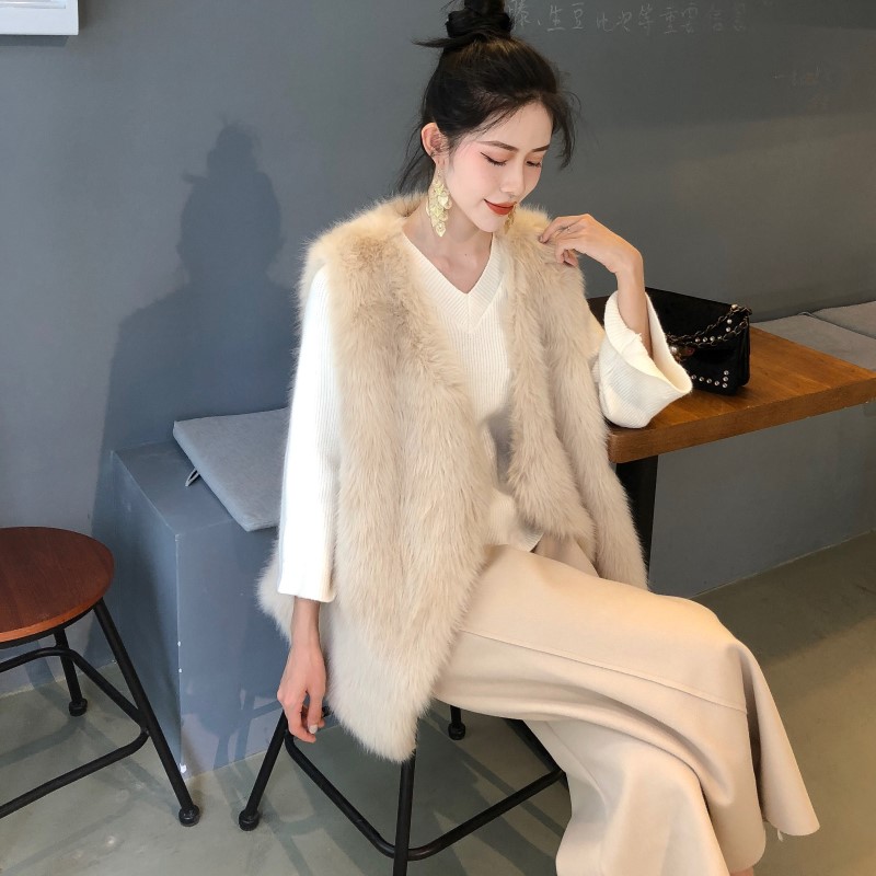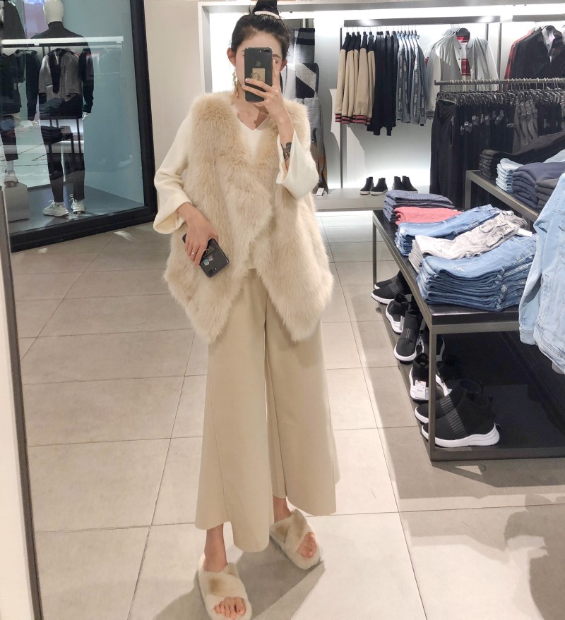 / 女神套裝秋冬新款百搭毛毛馬甲+寬松長袖針織衫+毛呢闊腿褲三件套