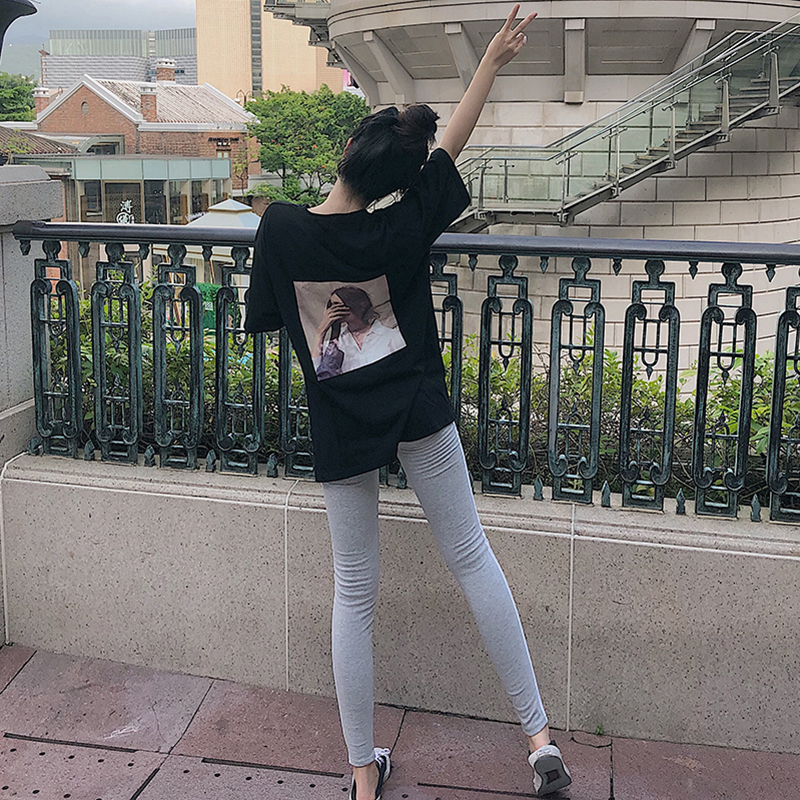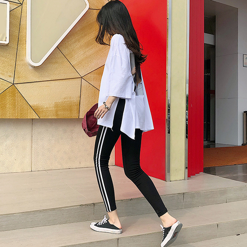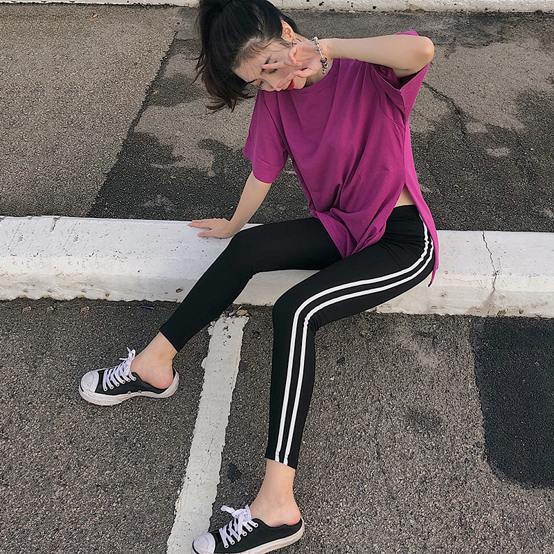 / 套裝女早秋新款女裝韓版中長款開叉印花短袖T恤+高腰條紋打底褲潮