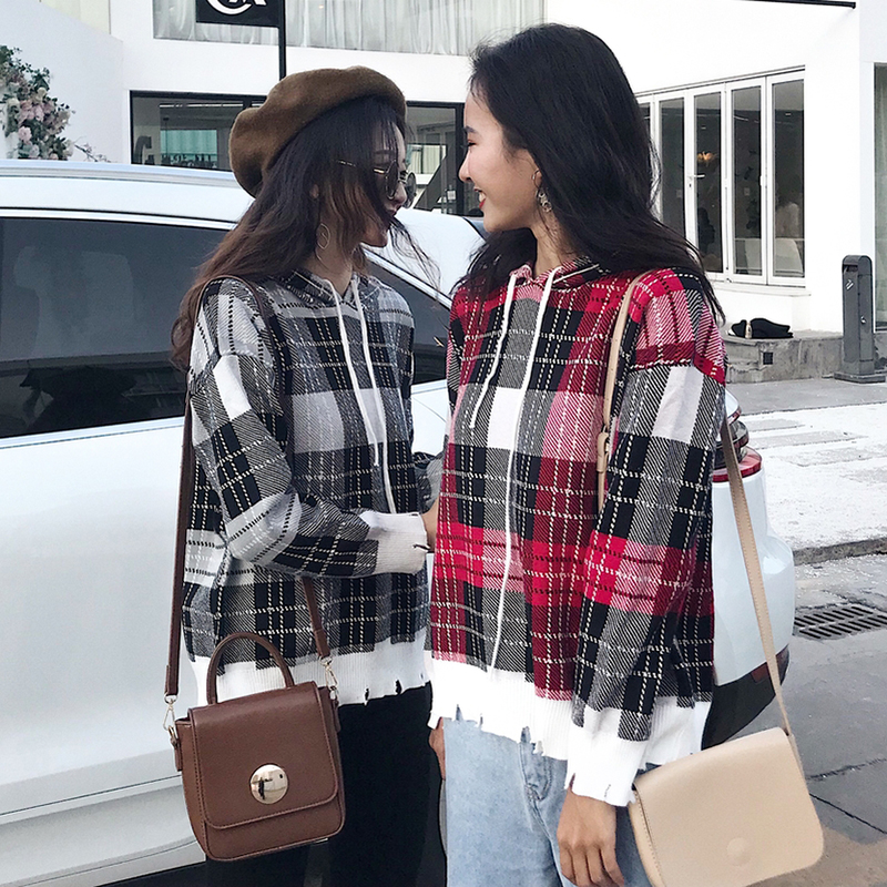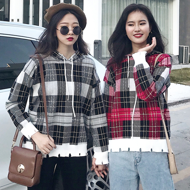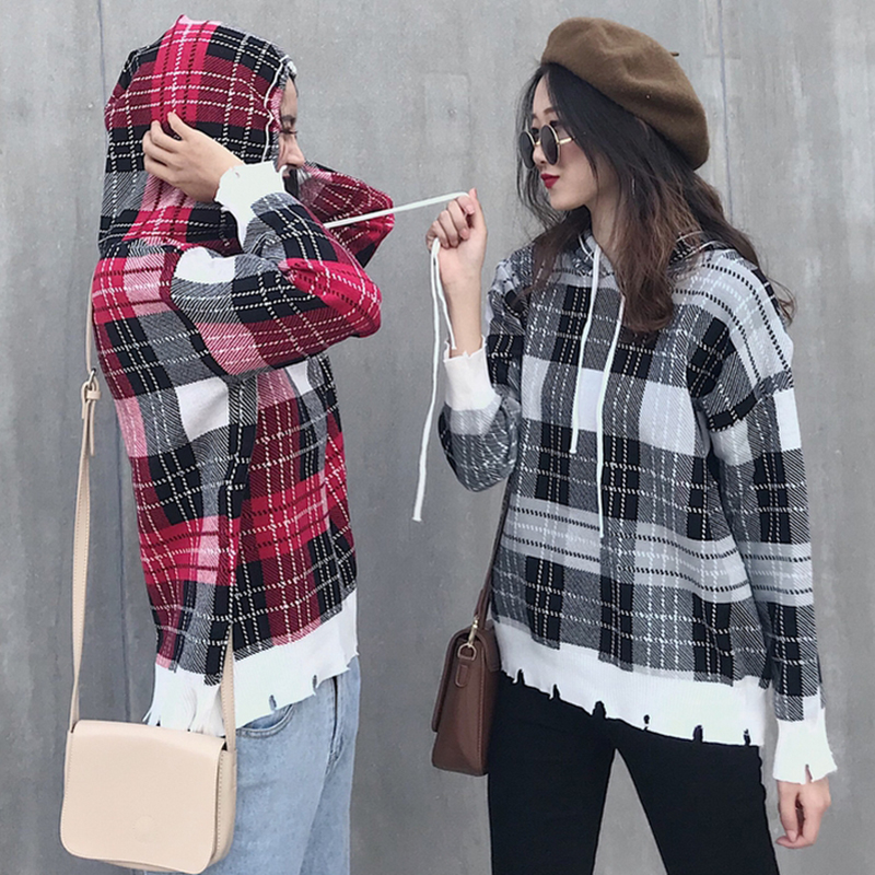 抽繩連帽毛衣女秋冬裝2018新款時尚格子針織外套學生休閑長袖上衣