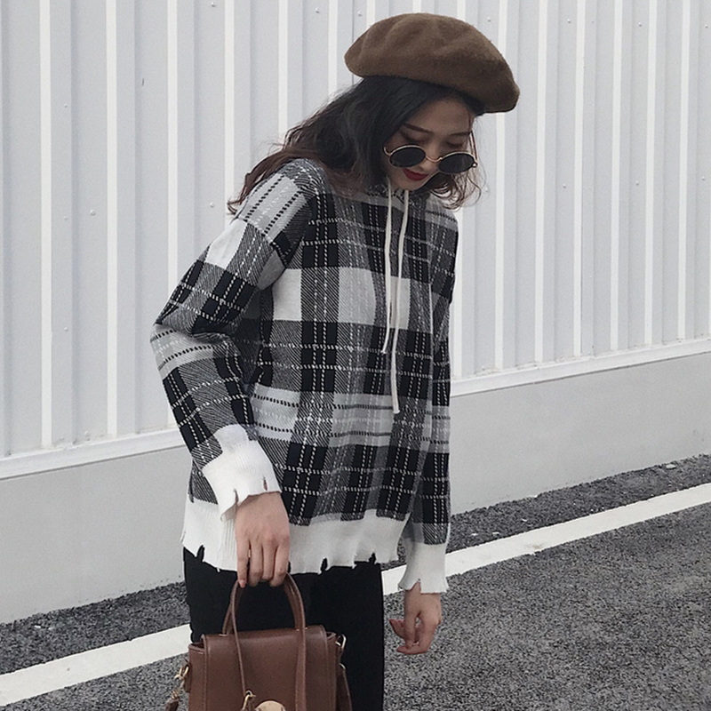 / 抽繩連帽毛衣女秋冬裝2018新款時尚格子針織外套學生休閑長袖上衣