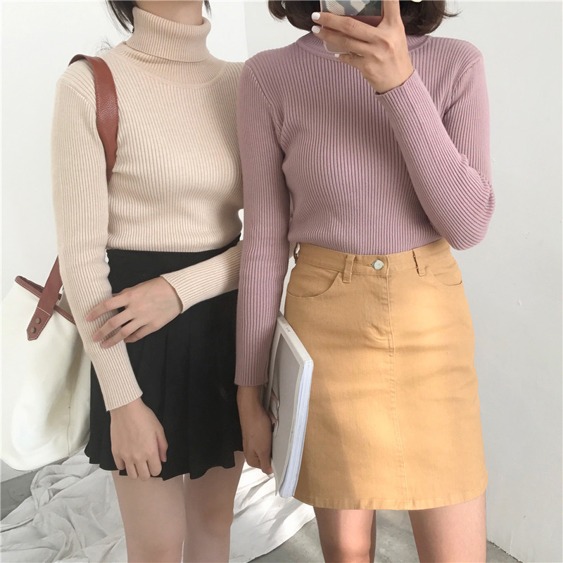 秋裝女2018新款純色高領長袖針織打底衫上衣修身顯瘦套頭薄款毛衣