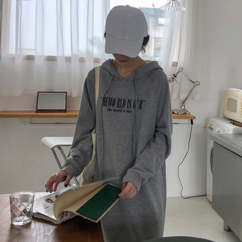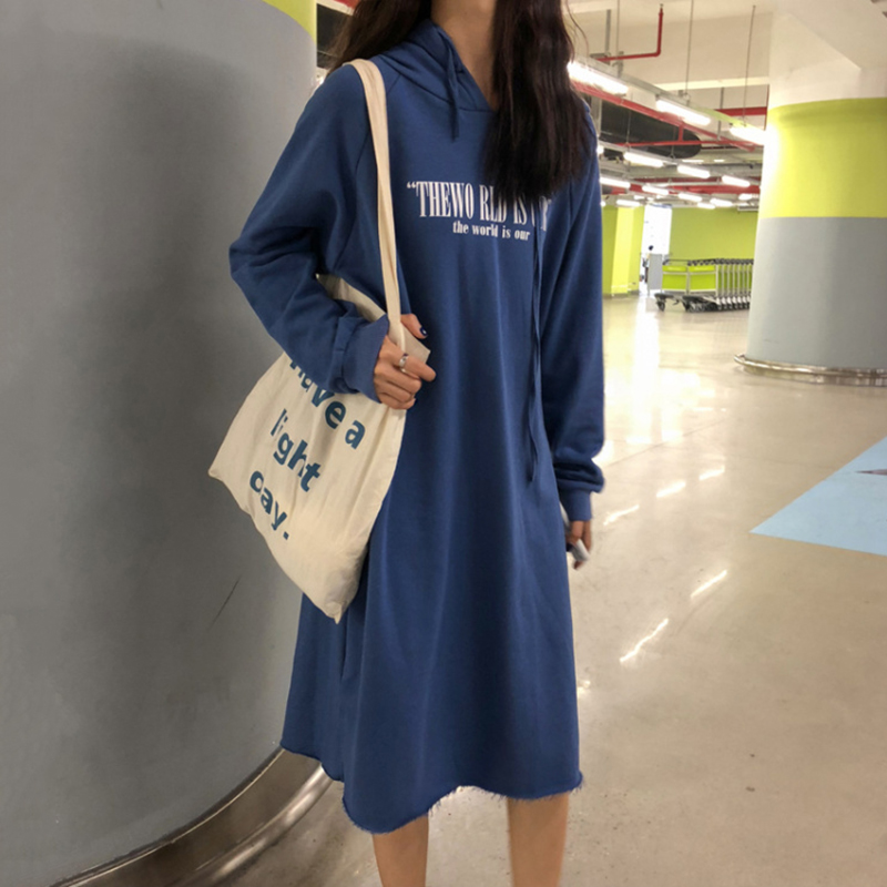 慵懶風長袖連衣裙女秋裝2018新款韓版字母寬松休閑連帽中長裙子潮