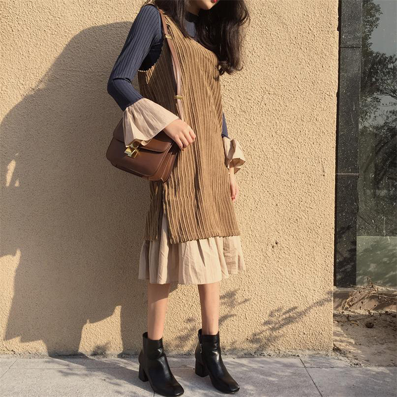 法式少女茶歇裙兩件套裝女秋冬燈芯絨背心喇叭長袖連衣裙蛋糕裙子