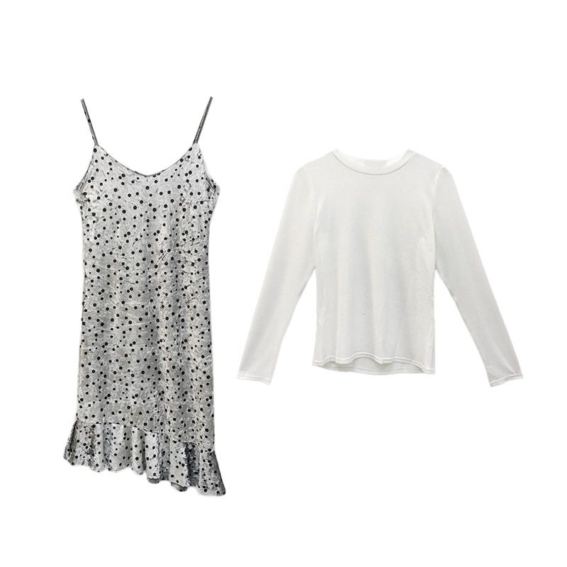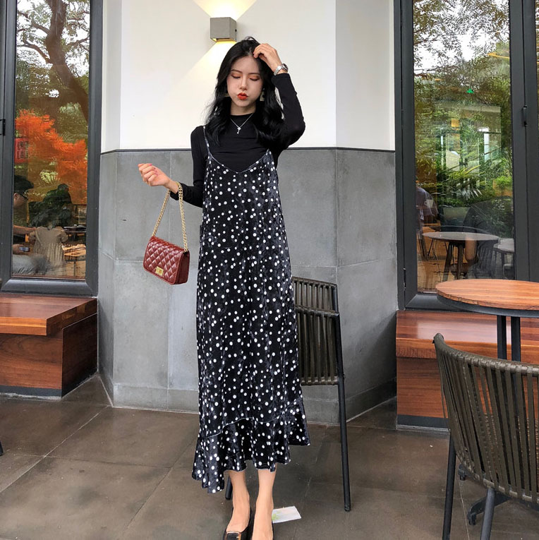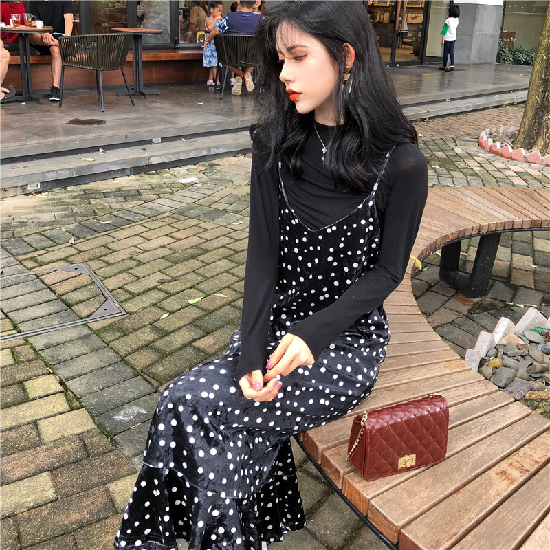 秋裝女2018新款荷葉邊中長款魚尾裙溫柔風波點連衣裙+修身打底T恤