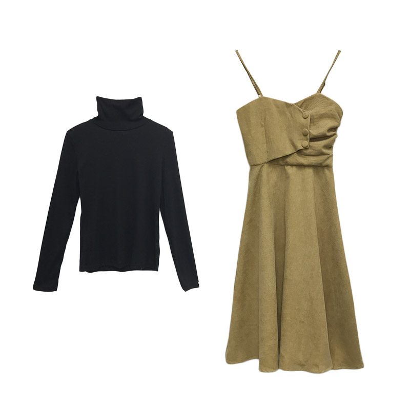 / 韓版修身復古中長款收腰燈芯絨吊帶連衣裙+黑色百搭高領打底衫潮