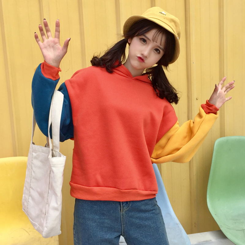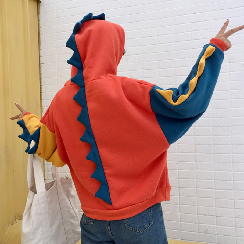 / 秋冬女裝韓版學院風個性撞色拼接可愛小恐龍寬松加絨連帽衛衣外套