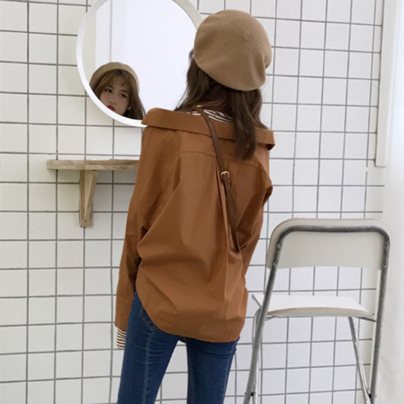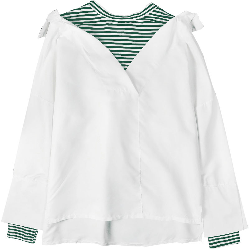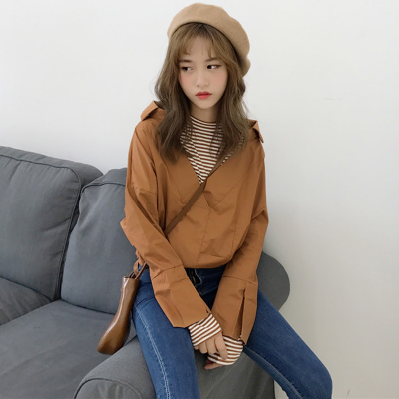 早秋2018新款韓版女裝假兩件條紋拼接開叉襯衫學生寬松喇叭袖上衣