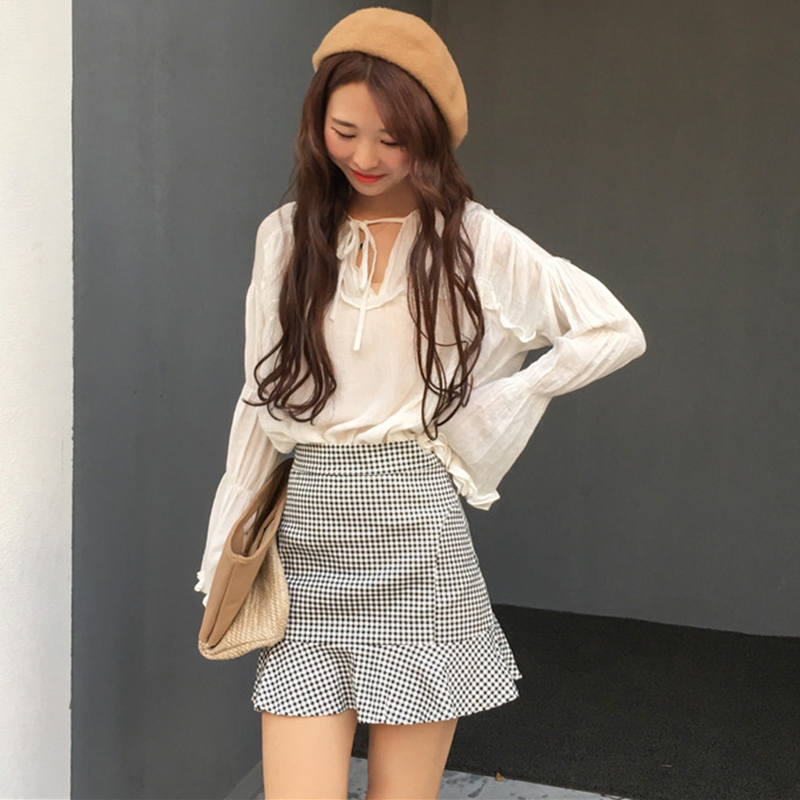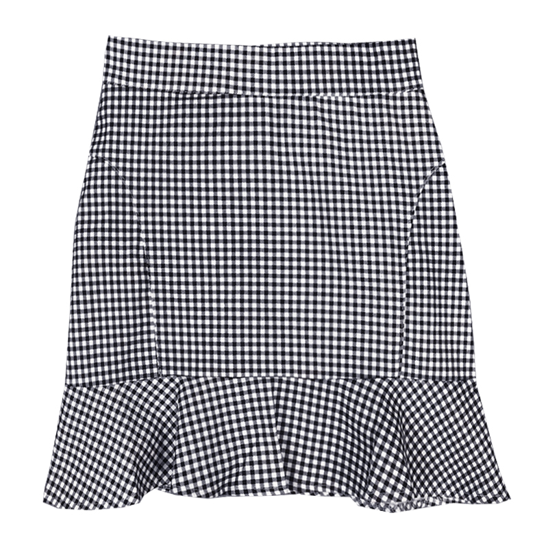 / 夏季新款女裝清新格子包臀A字短裙學生高腰顯瘦荷葉邊魚尾半身裙