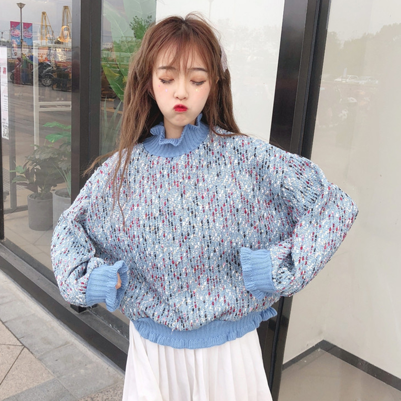 / 氣質木耳邊拼接燈籠袖衛衣女秋冬裝2018新款寬松套頭粗花毛呢外套