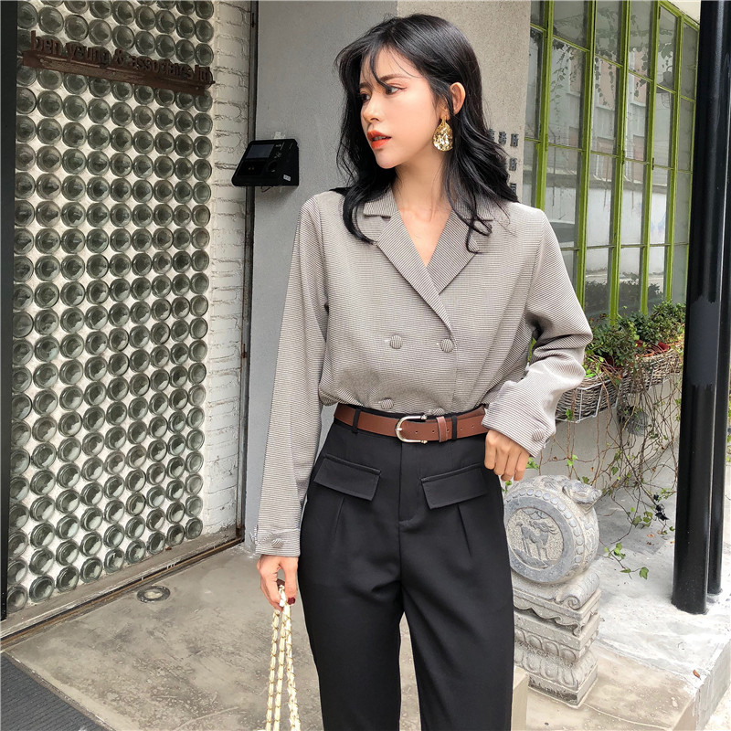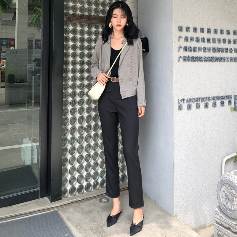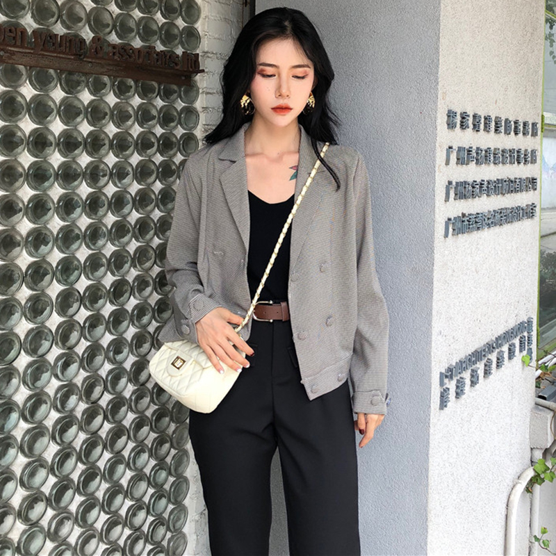 / 御姐套裝女秋冬新款時尚格紋翻領短外套高腰顯瘦黑色休閑九分褲子