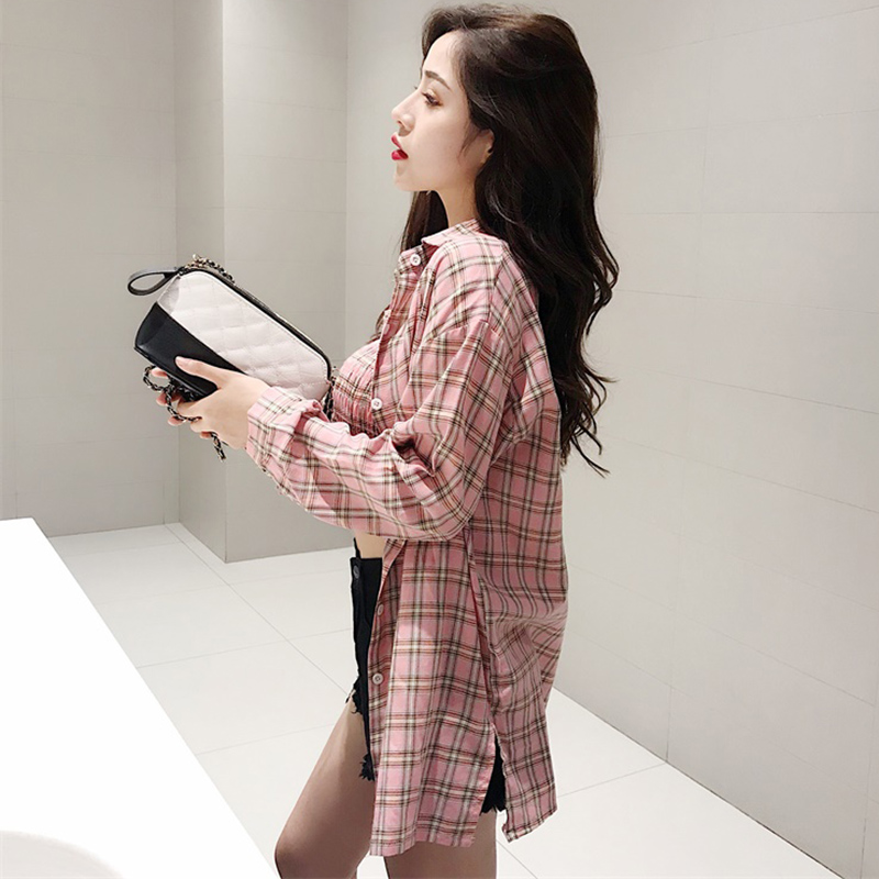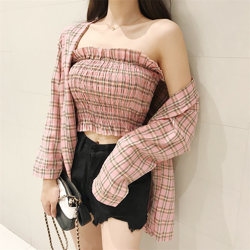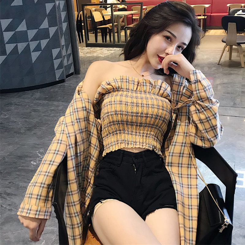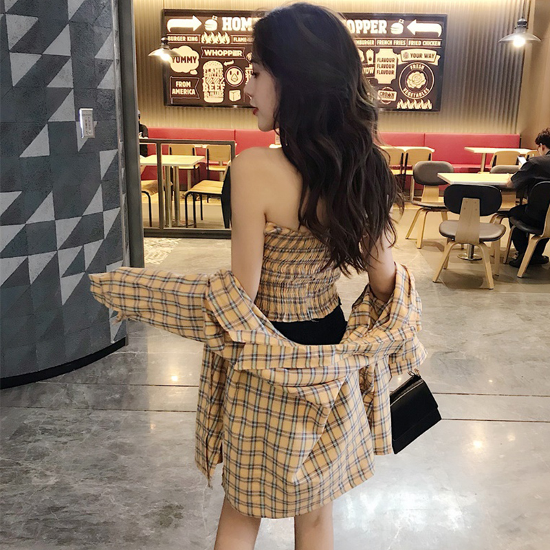 早秋新款女裝復古寬松格子襯衫防曬外套+木耳邊裹胸抹胸兩件套裝