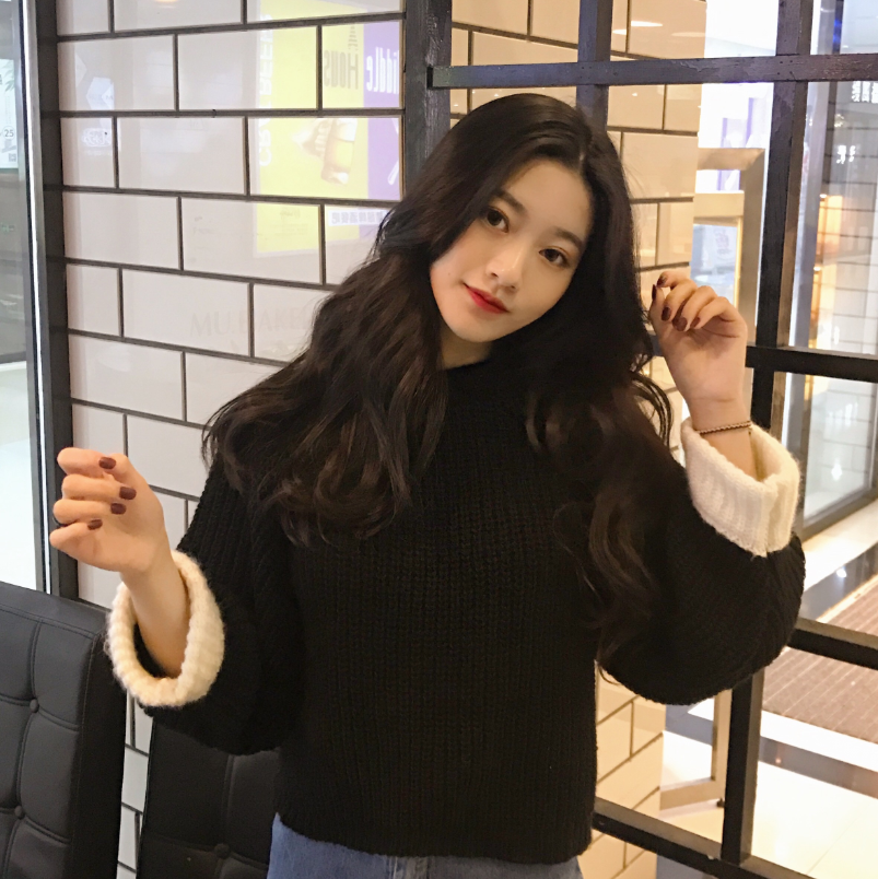 / 韓版時尚chic秋冬毛衣慵懶風針織開衫套頭拼色百搭短款毛衣外套女