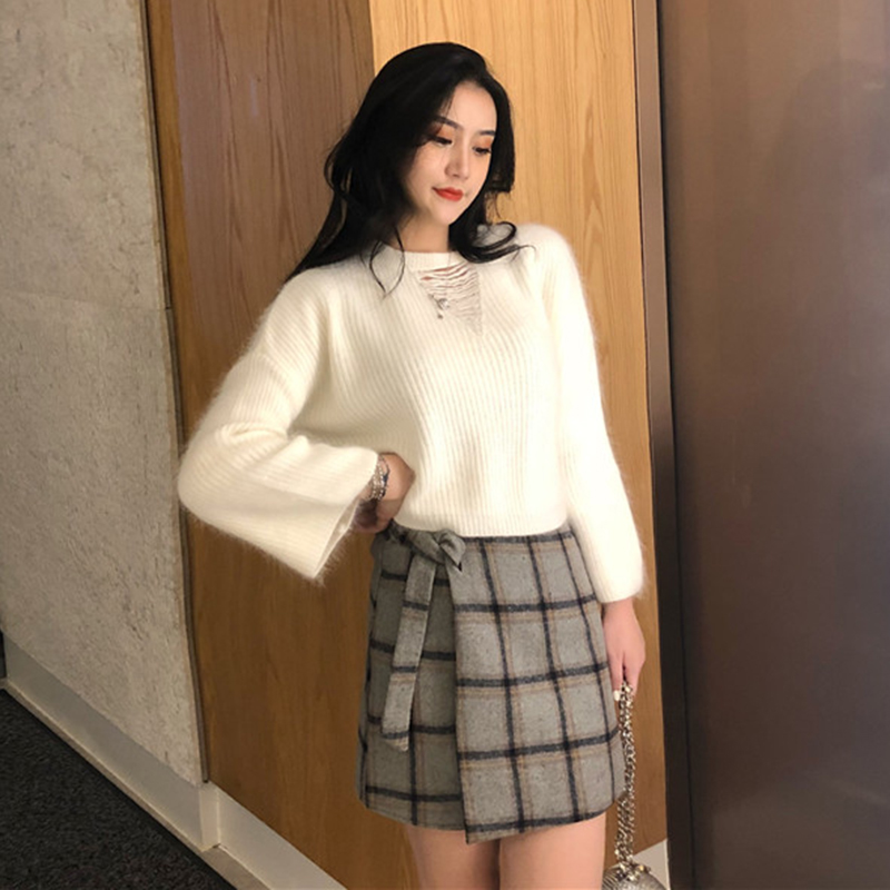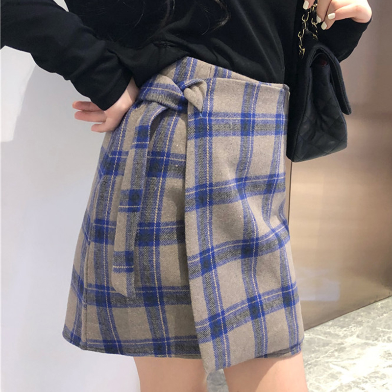 / 秋冬女裝2018新款韓版高腰顯瘦毛呢A字短裙系帶復古風格子半身裙