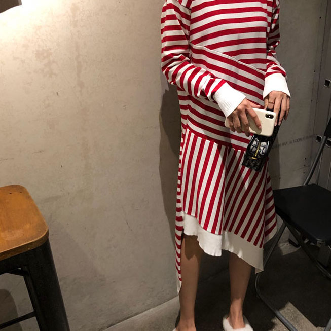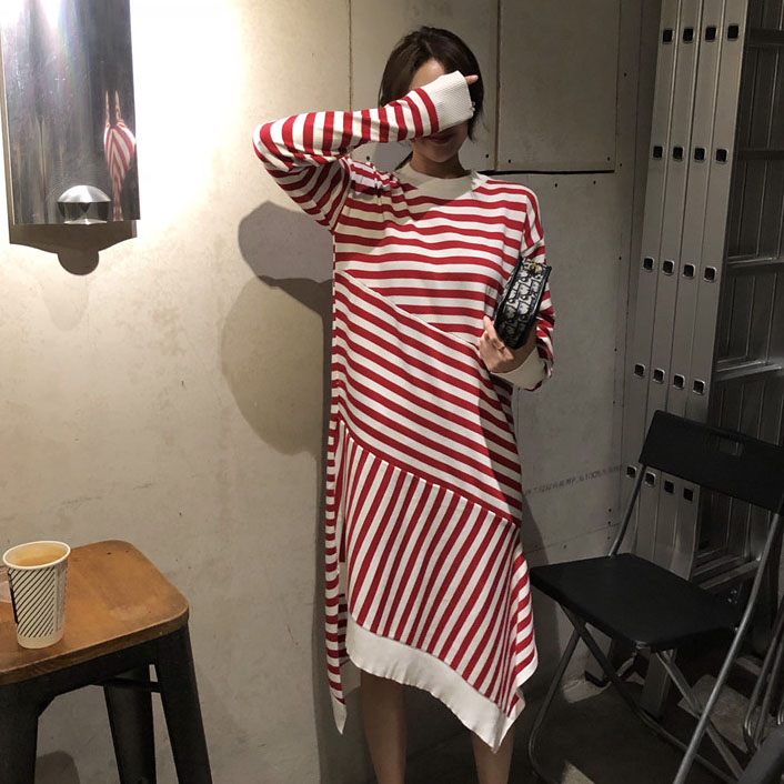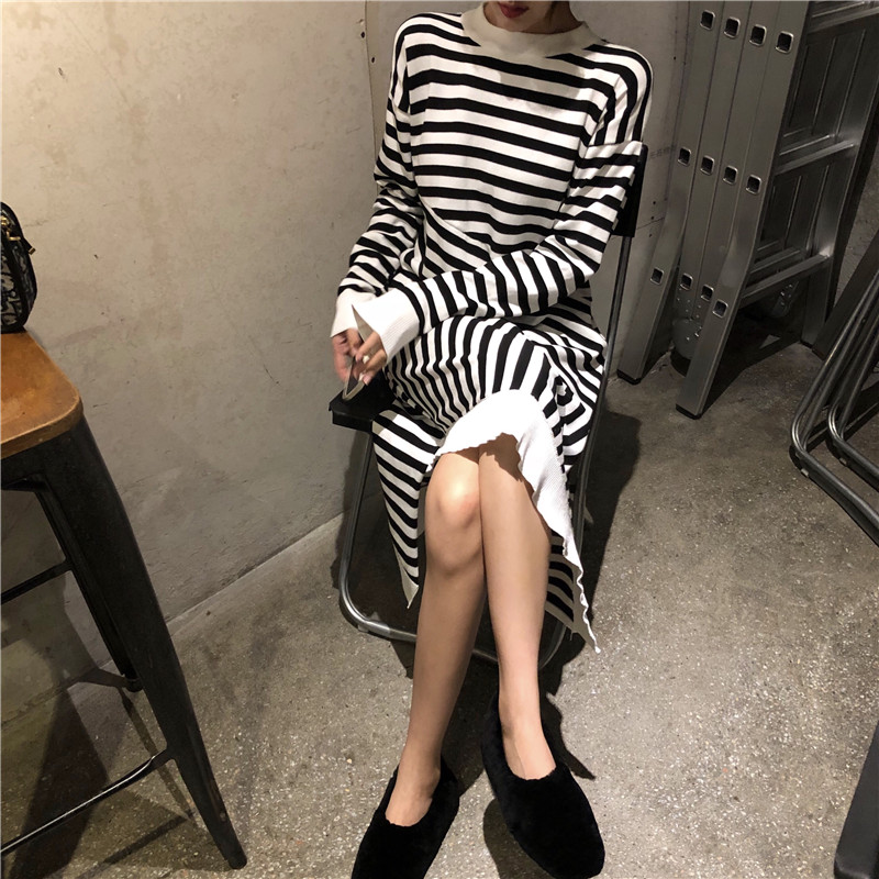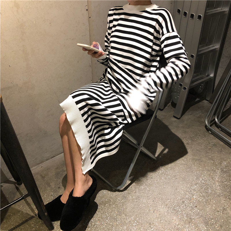 / 韓版復古不規則條紋針織連衣裙女2018新款長袖圓領斜角顯瘦中長裙