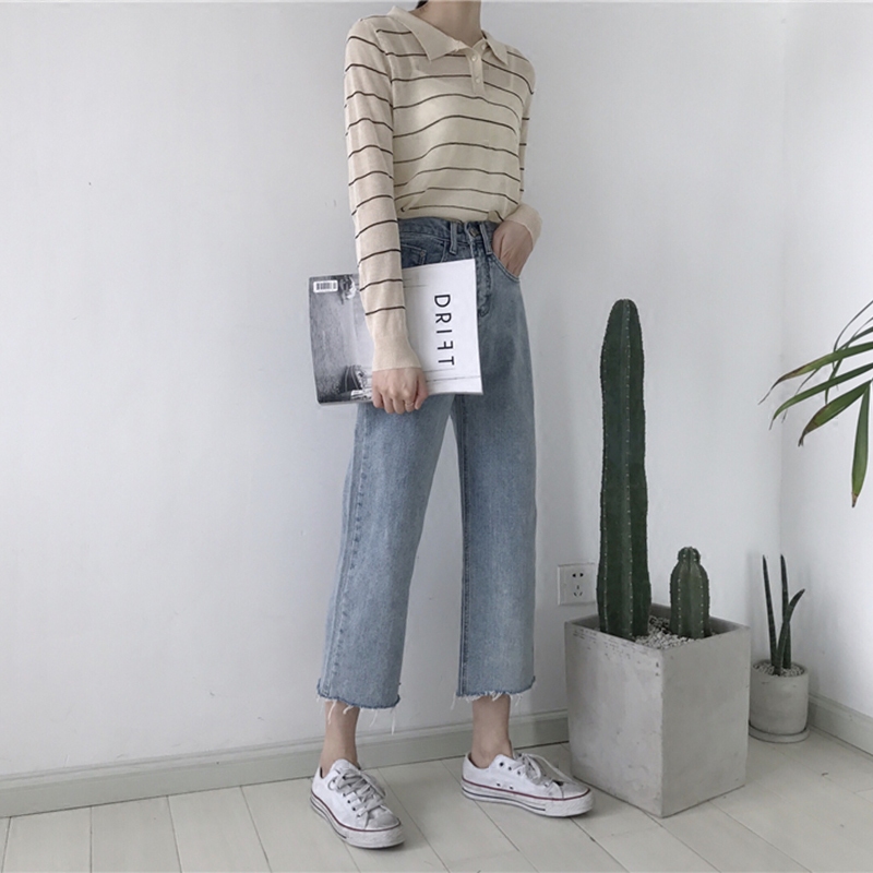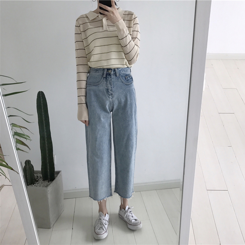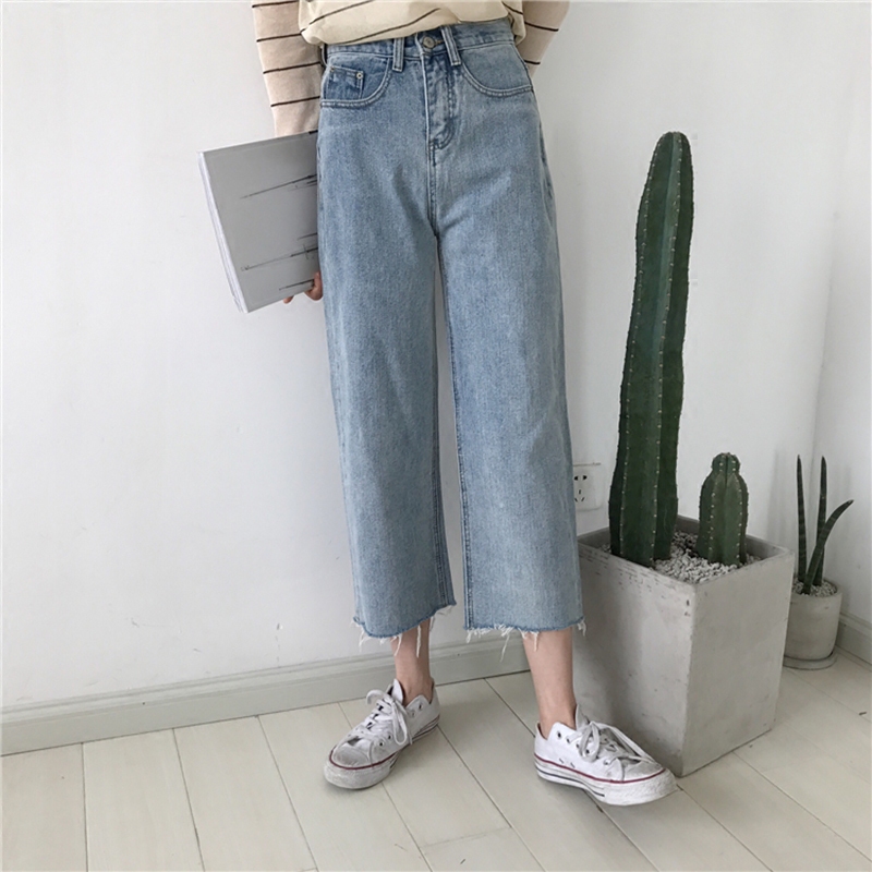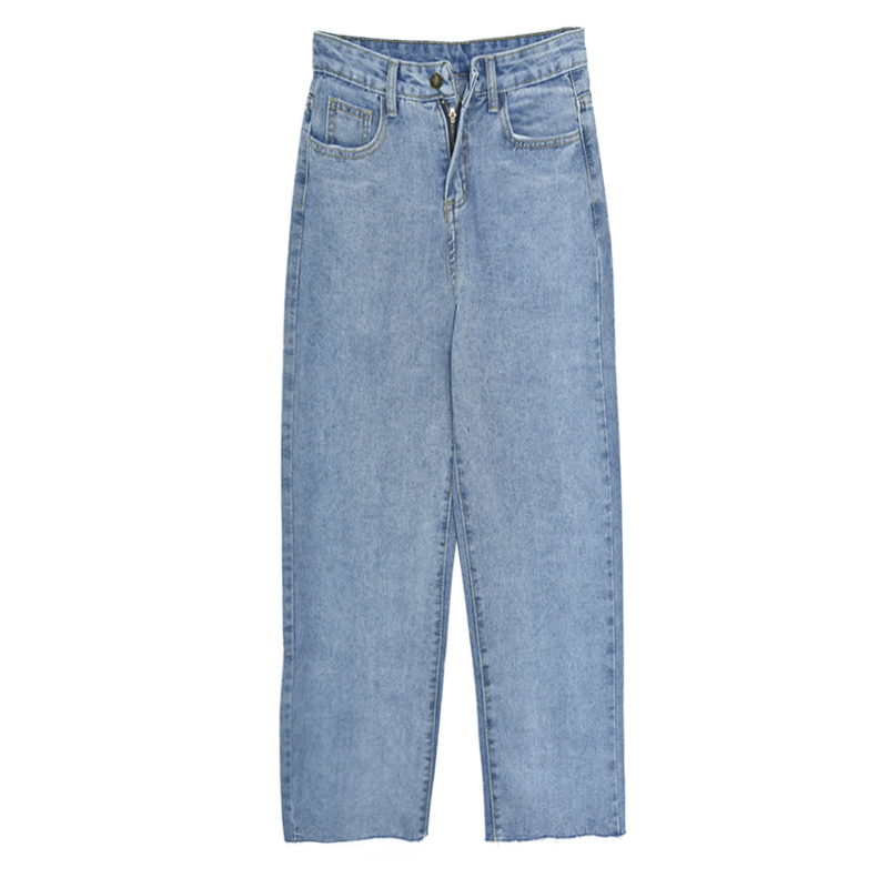 港味復古韓國chic風復古顯瘦淺色撕邊牛仔褲高腰百搭休閑闊腿褲女