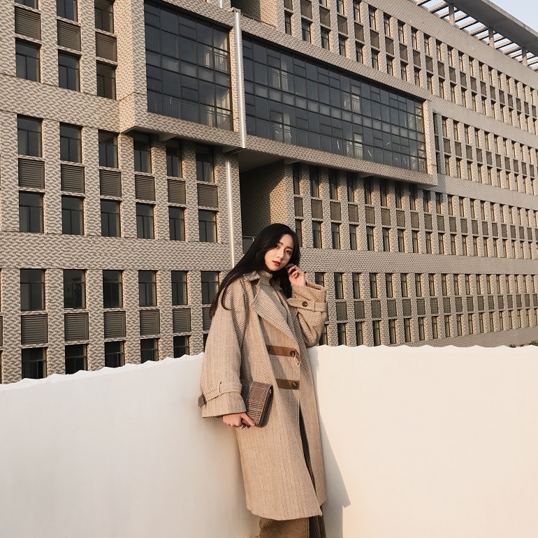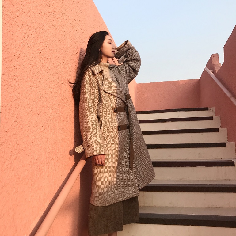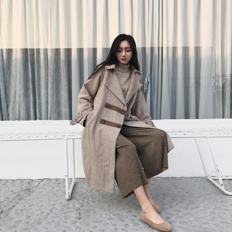 復古溫柔慵懶風隨意暖色系百搭寬松中長款毛呢外套女韓版呢子大衣
