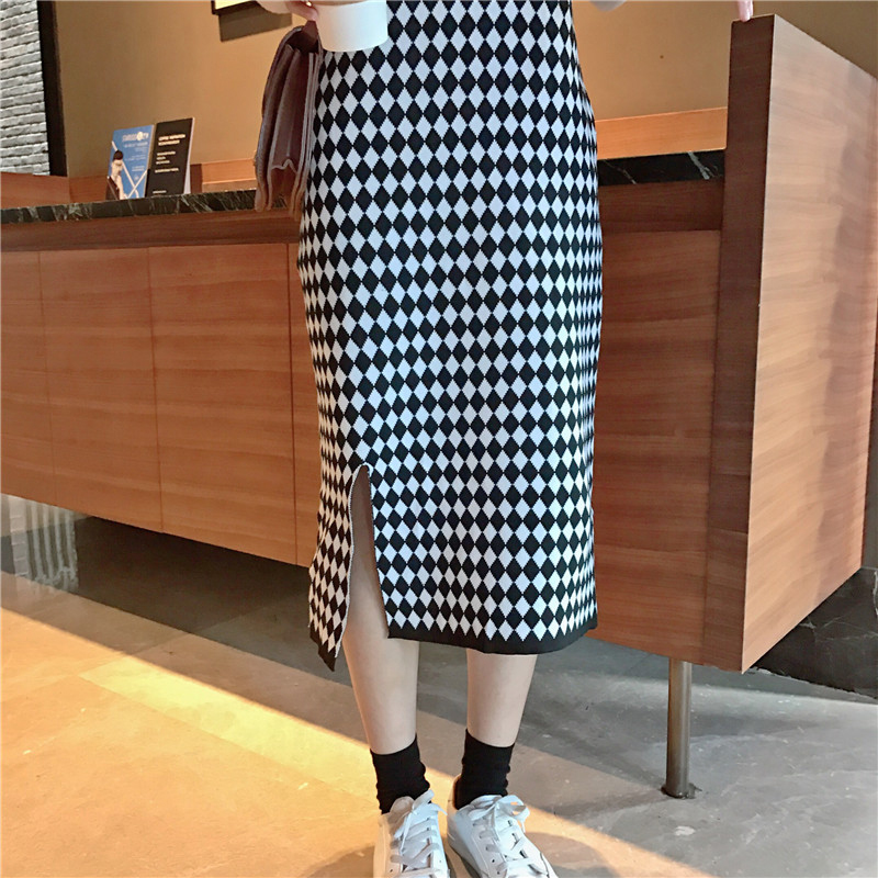 / 套裝女秋季新款菱形格子開叉吊帶針織裙修身半高領長袖打底衫T恤