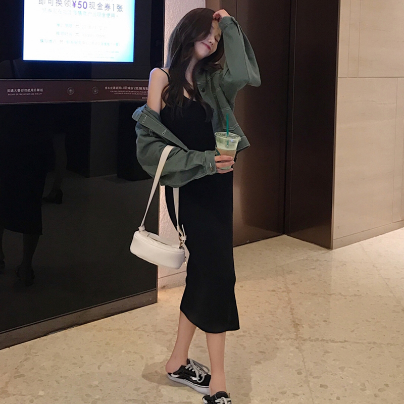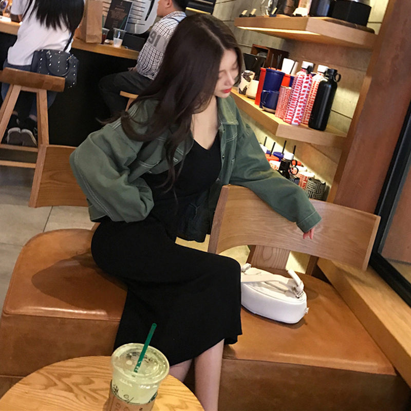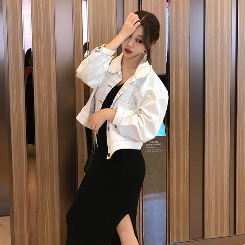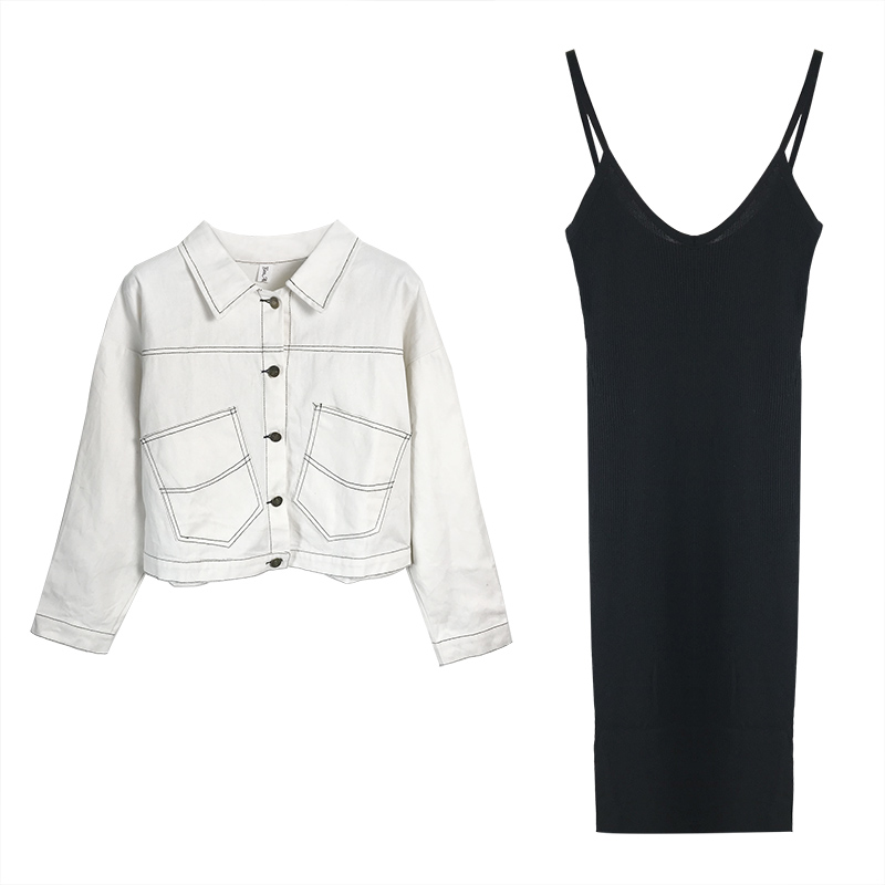 / 女秋新款韓版寬松明線牛仔短外套上衣黑色開叉吊帶連衣裙子潮套裝