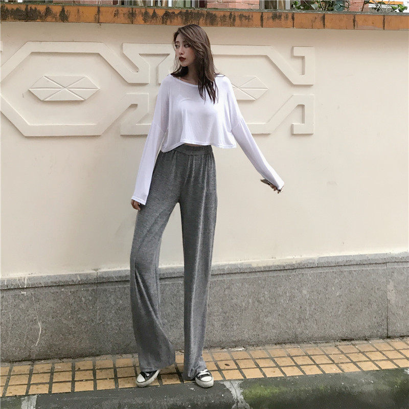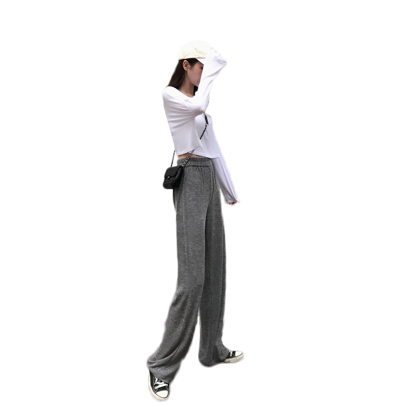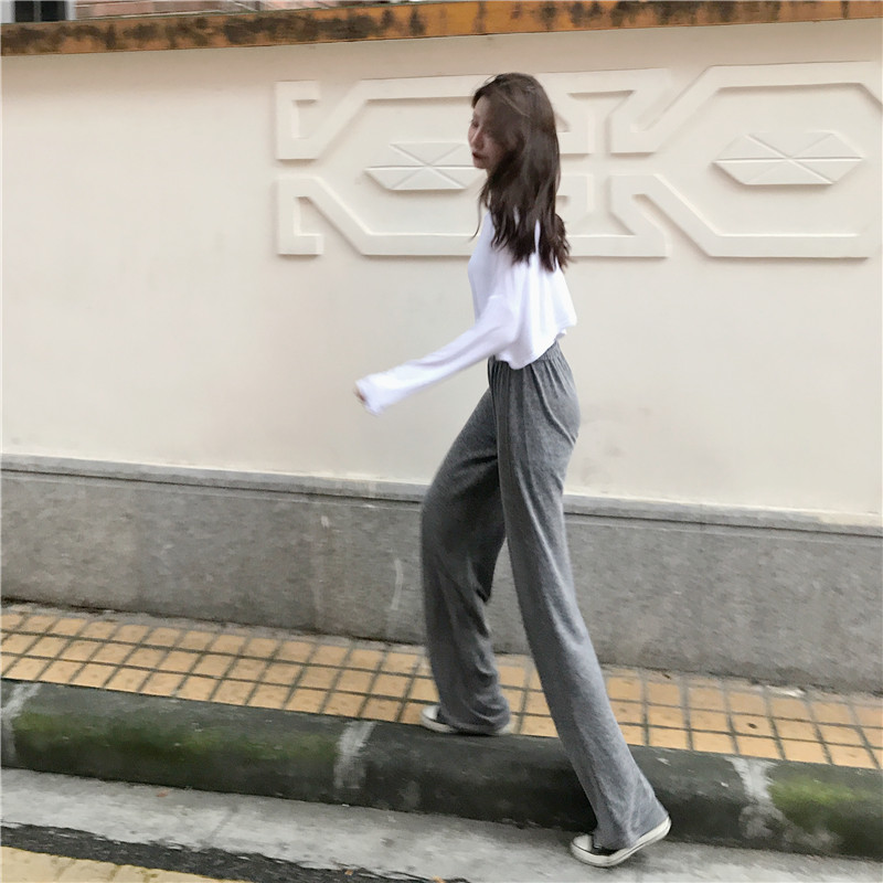 秋裝女2018新款潮流純色夏季顯瘦拖地薄款針織闊腿褲長褲直筒褲子