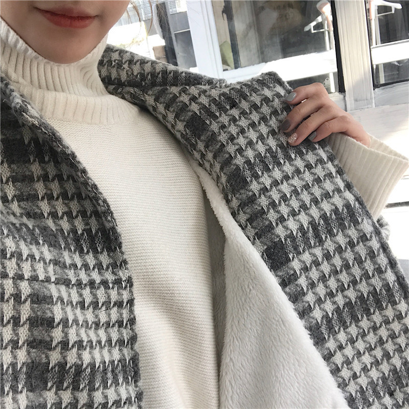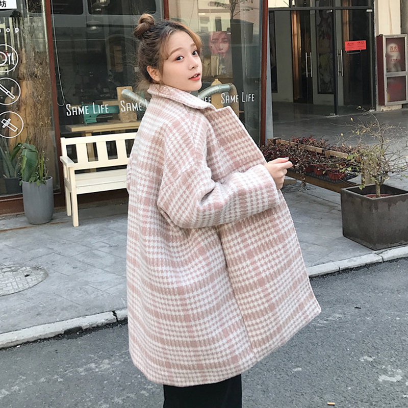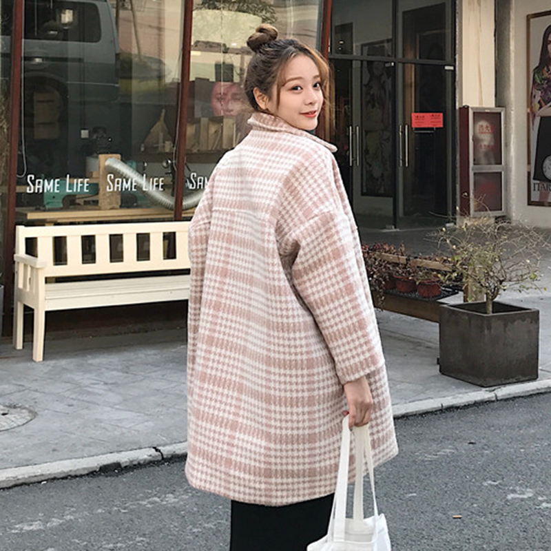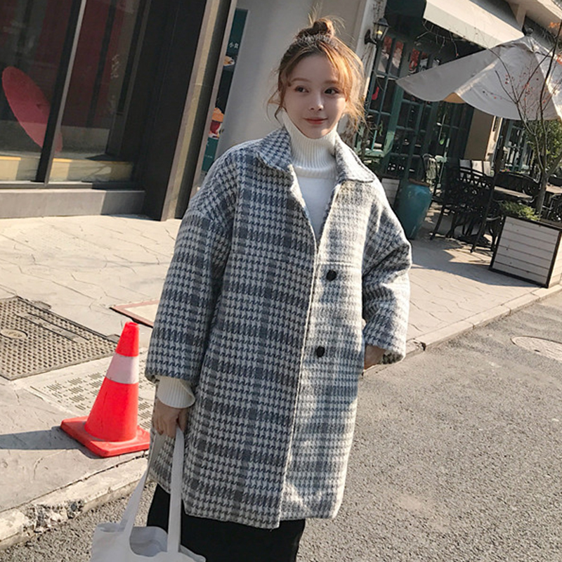 / 復古千鳥格中長款毛呢大衣秋裝女2018新款寬松長袖上衣休閑外套潮