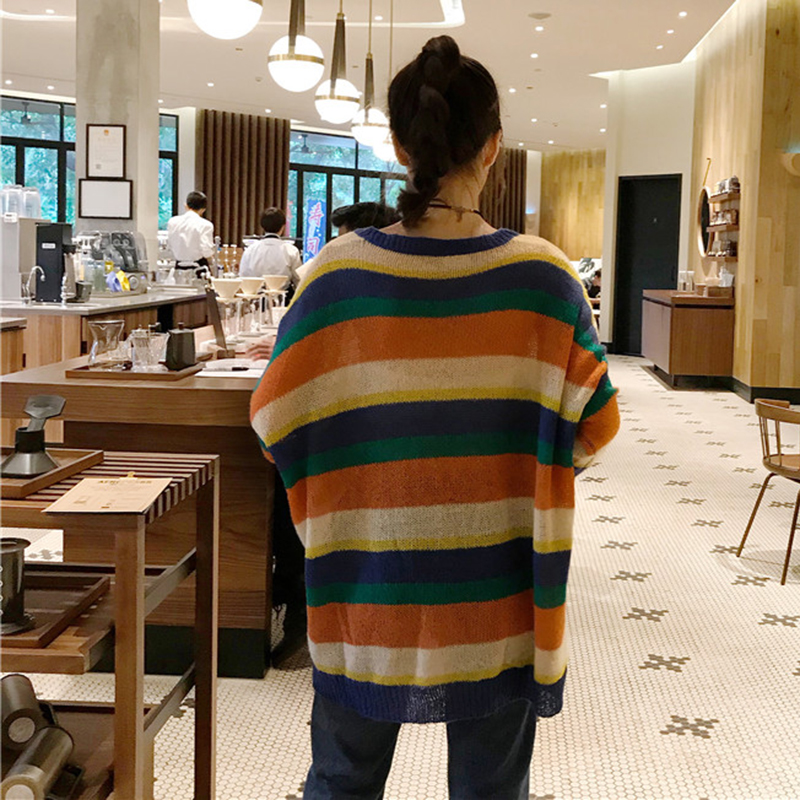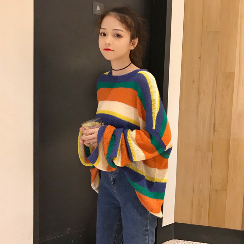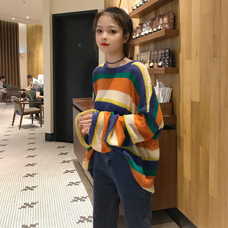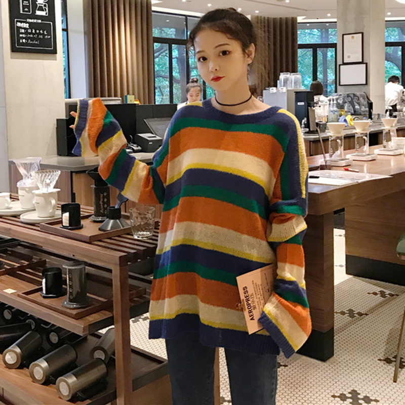 / chic風彩虹條紋長袖針織衫女秋冬裝2018新款韓版寬松套頭毛衣外套