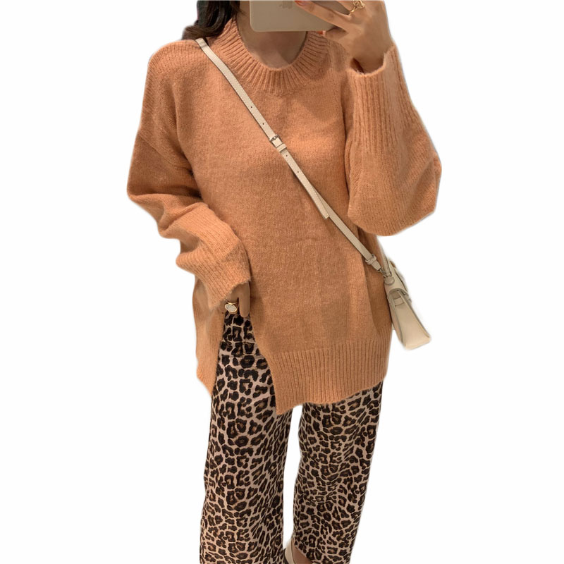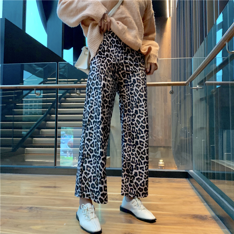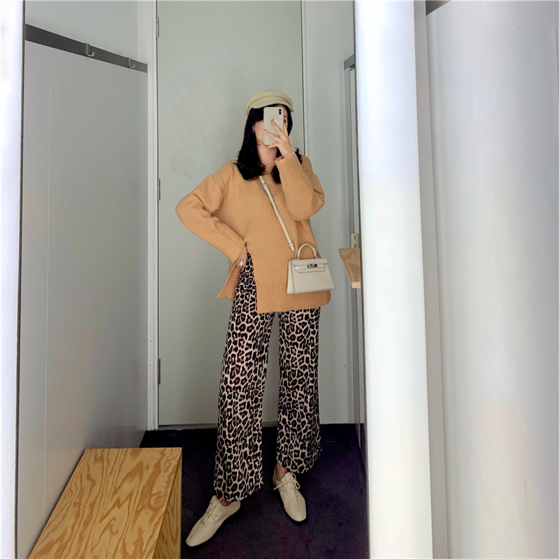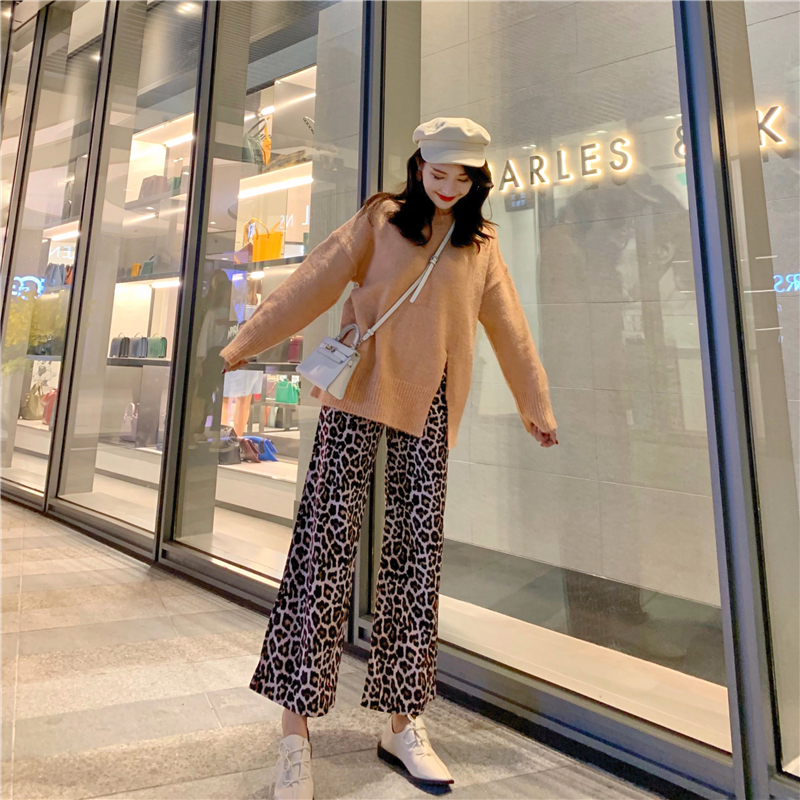 慵懶風開叉毛衣女秋冬2018新款+復古豹紋休閑褲高腰九分闊腿褲潮
