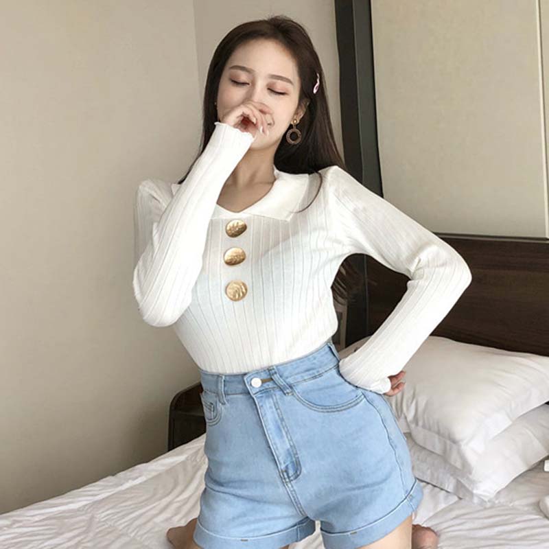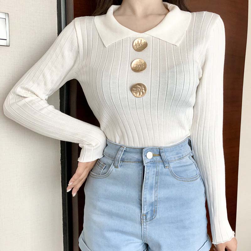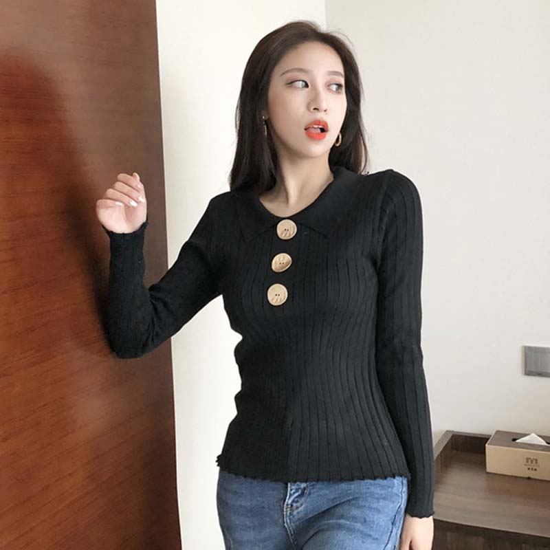 / 復古風紐扣裝飾翻領針織衫女秋裝新款修身打底衫彈力氣質長袖上衣