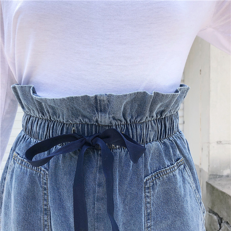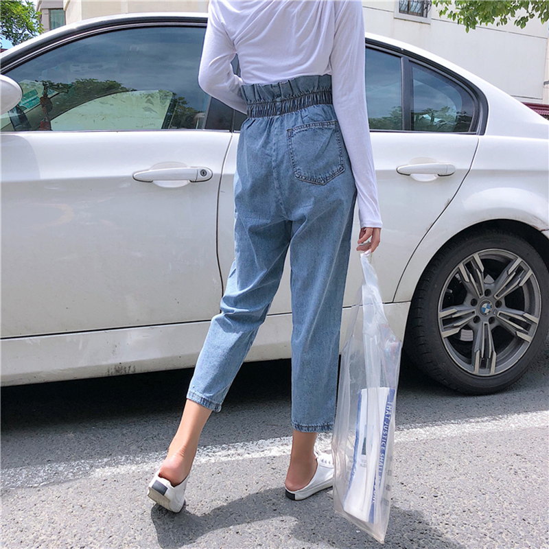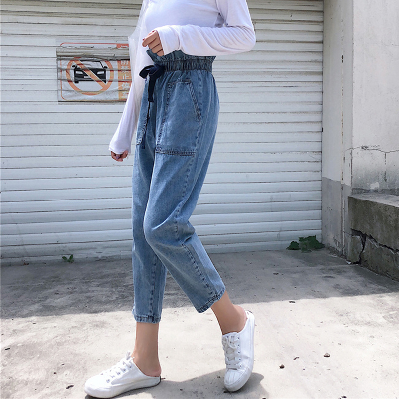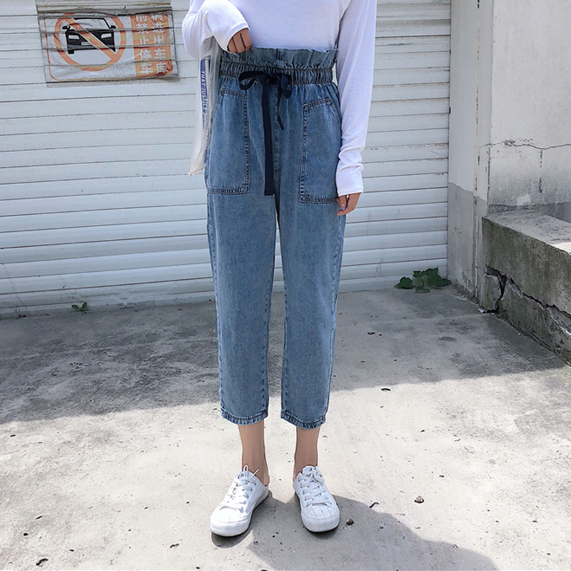 / 長褲女秋新款女裝韓版寬松水洗做舊牛仔褲花苞松緊高腰九分哈倫褲