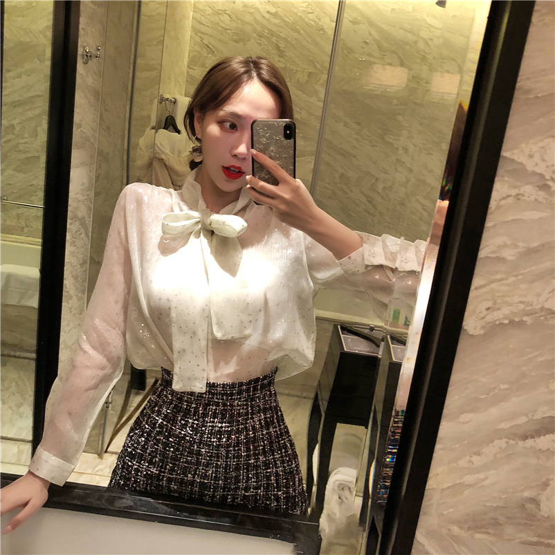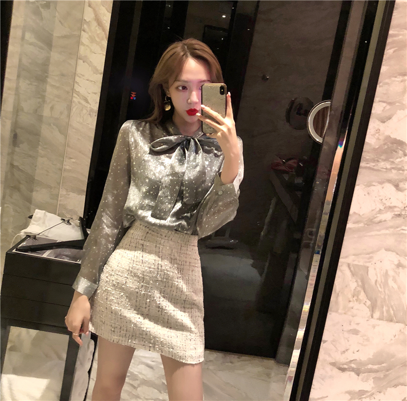 時尚套裝夏系帶透明閃閃長袖襯衣+毛呢格子高腰修身短裙潮分開拍