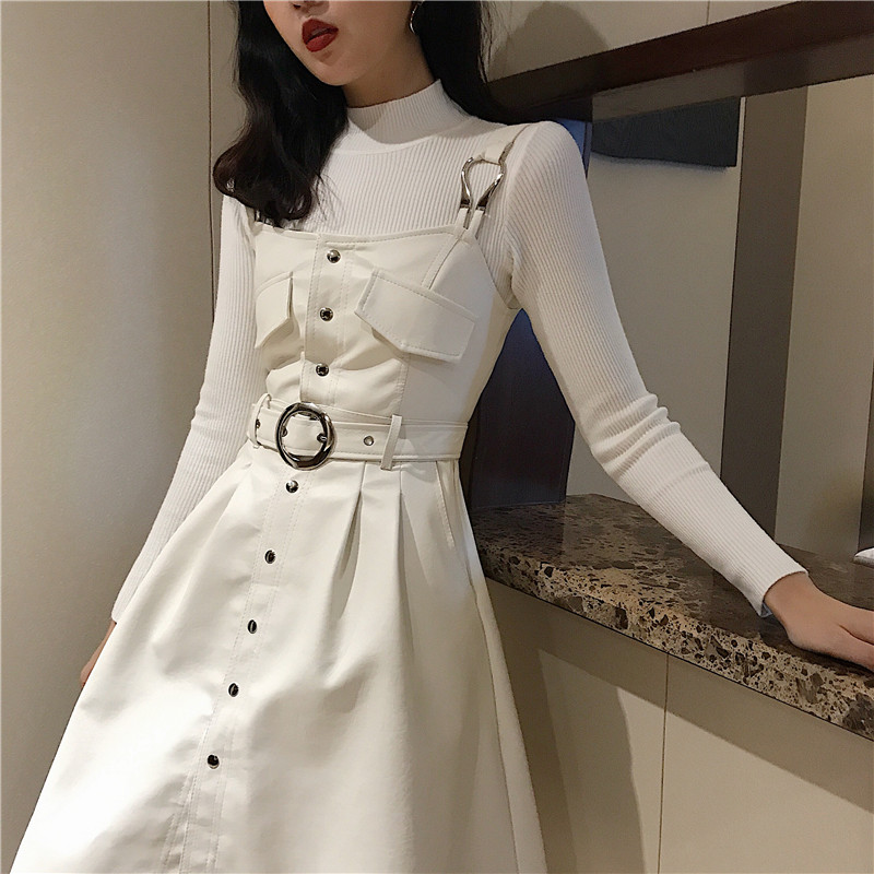 女神套裝秋冬新款半高領修身打底衫+單排扣PU皮背帶裙時尚兩件套