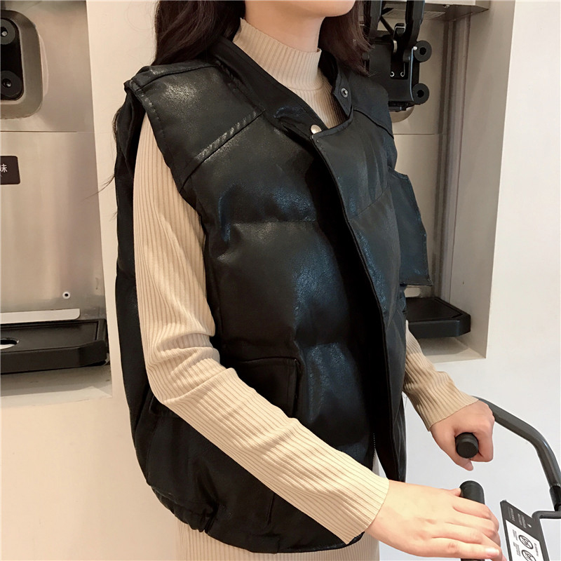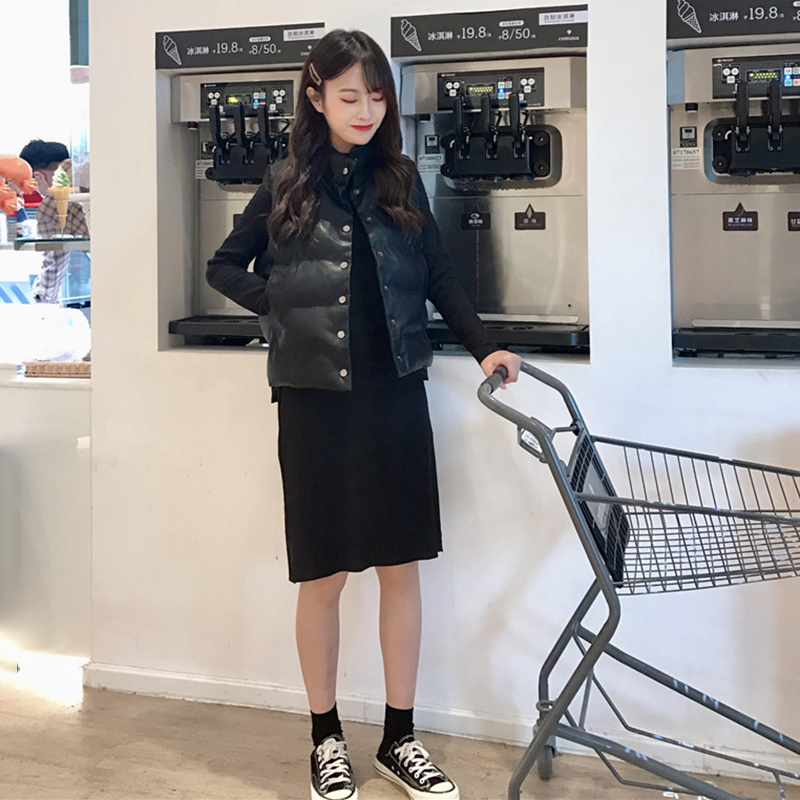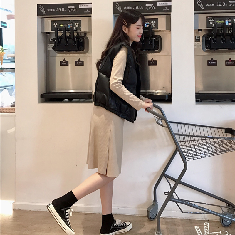 / 洋氣套裝女秋冬新款時尚pu皮坎肩棉衣馬甲氣質修身長袖打底連衣裙