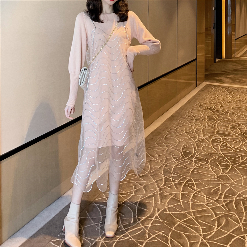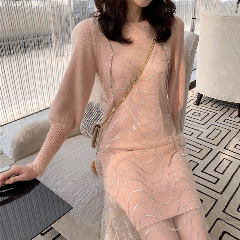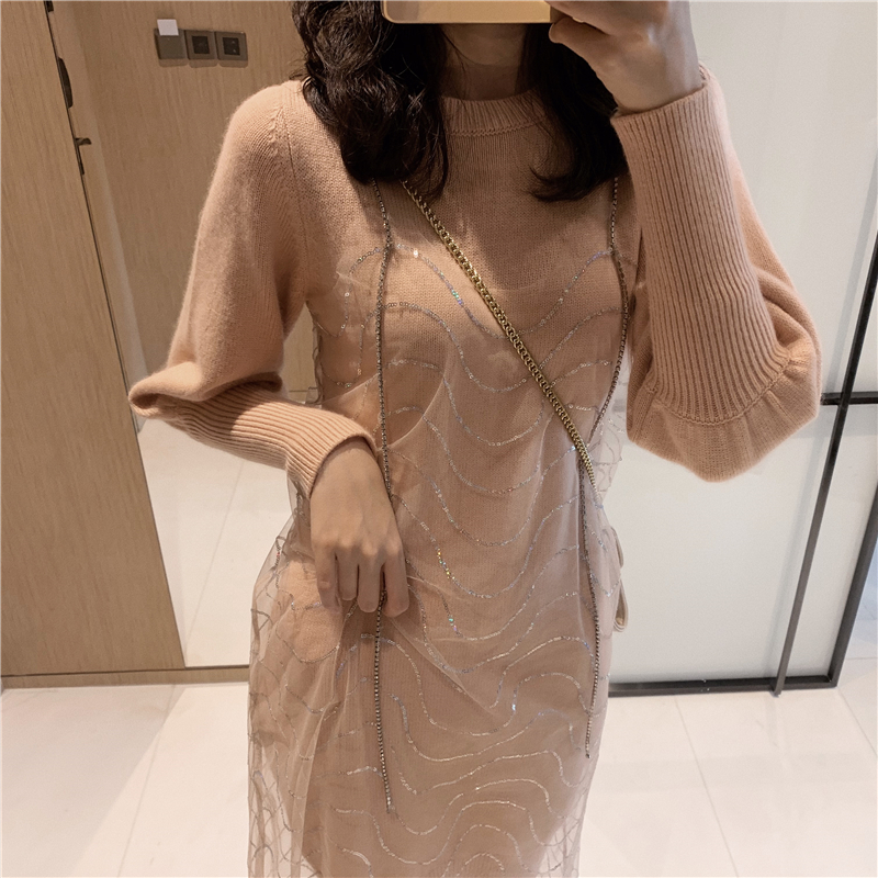 韓版秋裝女2018新款套裝溫柔風珠片繡鉆吊帶+針織連衣裙女兩件套