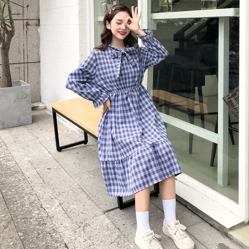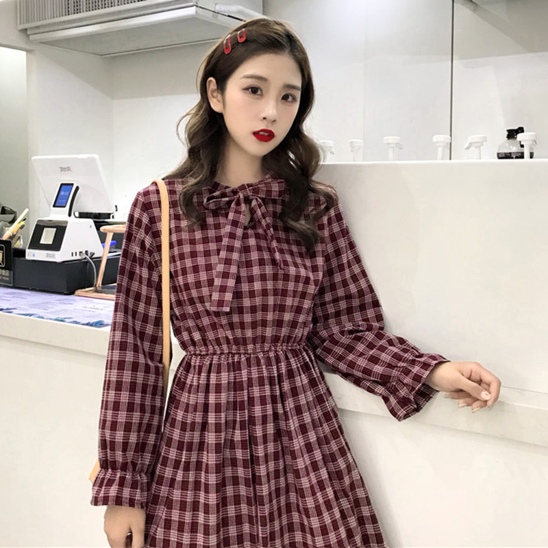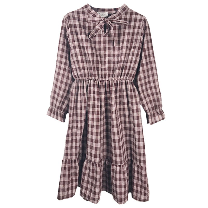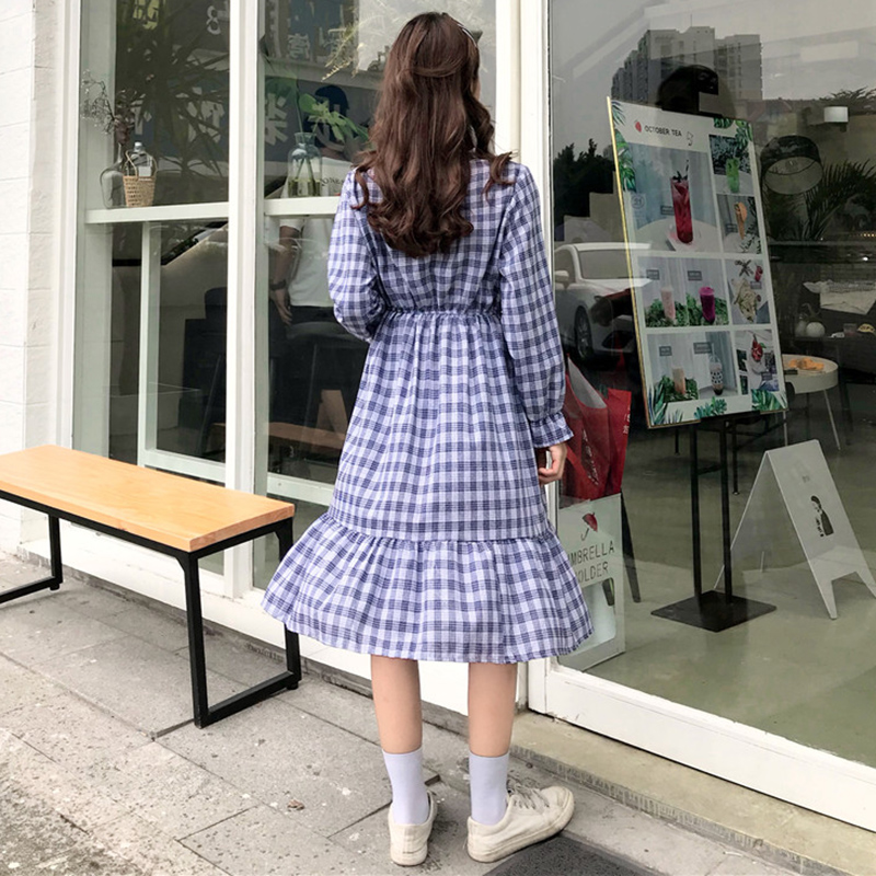 / 學院風格子連衣裙女新款秋裝復古學生中長裙少女清新荷葉邊A字裙