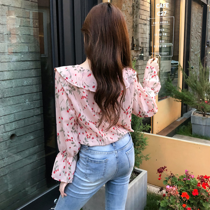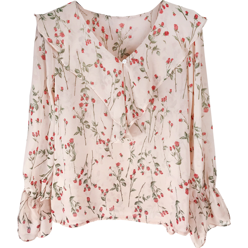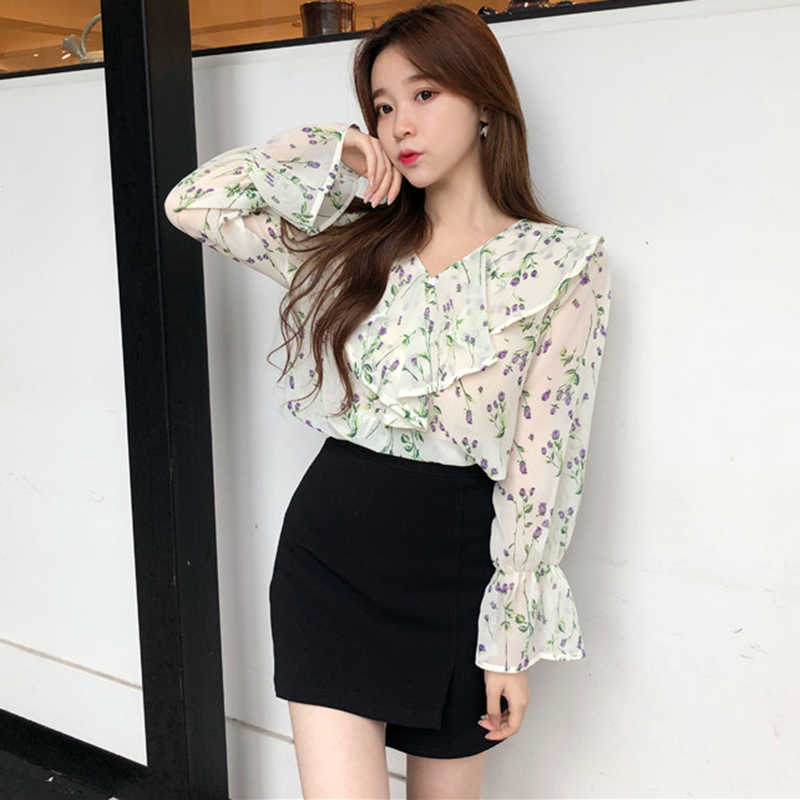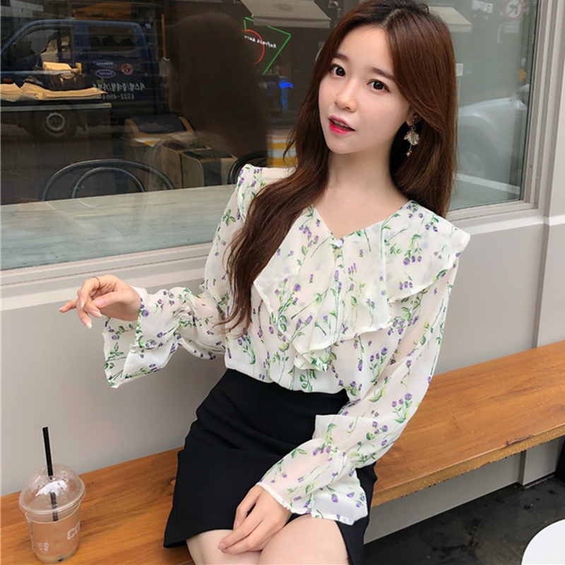 / 印花襯衫早秋2018新款女裝韓版氣質喇叭長袖荷葉邊雪紡衫防曬上衣