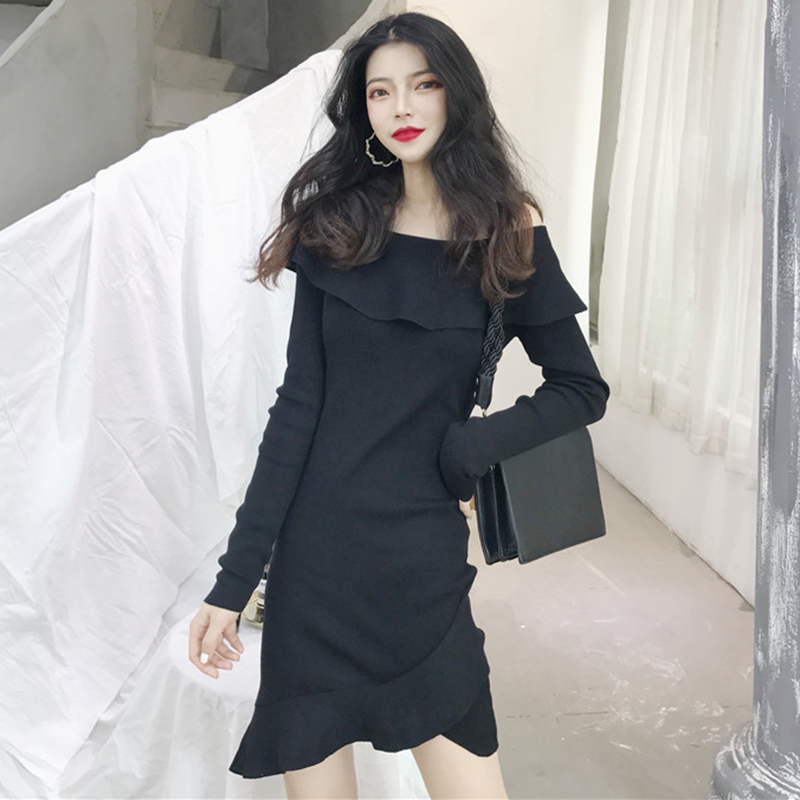 / 秋裝女新款氣質修身一字肩長袖針織連衣裙洋氣黑色荷葉邊A字裙子
