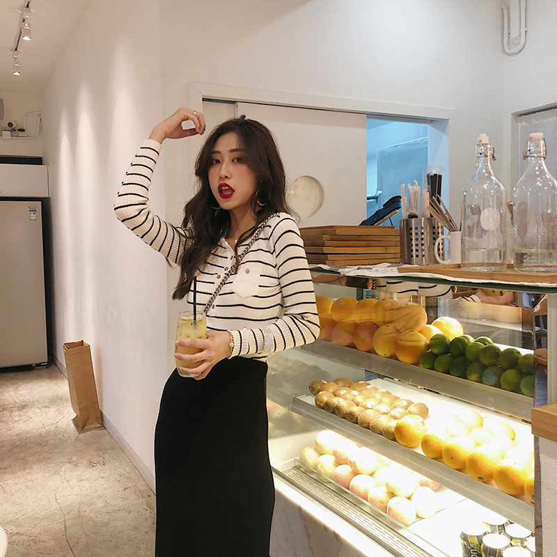 秋裝女2018新款修身顯瘦韓版時尚百搭打底上衣復古條紋長袖針織衫