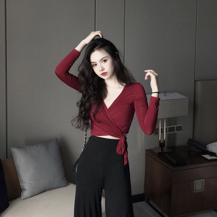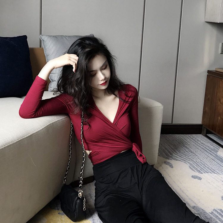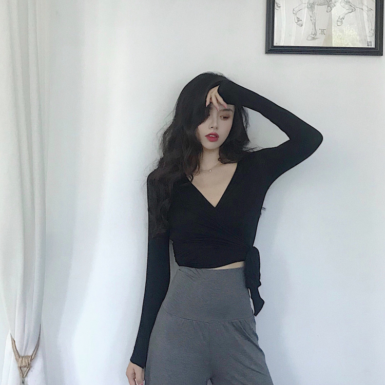2018新款性感V領系帶打結T恤短款開衫+韓版百搭高腰闊腿褲分開拍