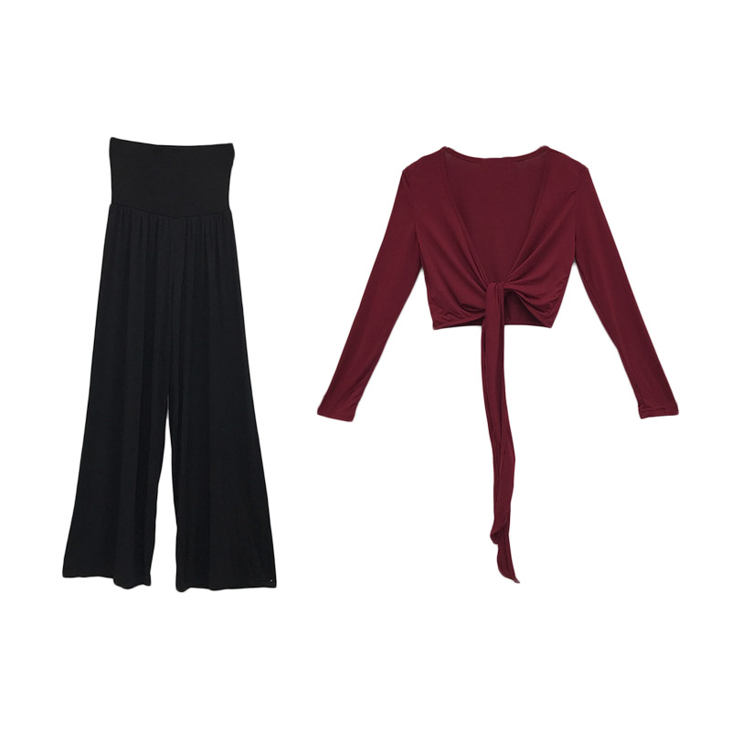 chic早秋上衣V領荷葉邊酒紅色長袖襯衫+高腰垂感拖地休閑直筒長褲
