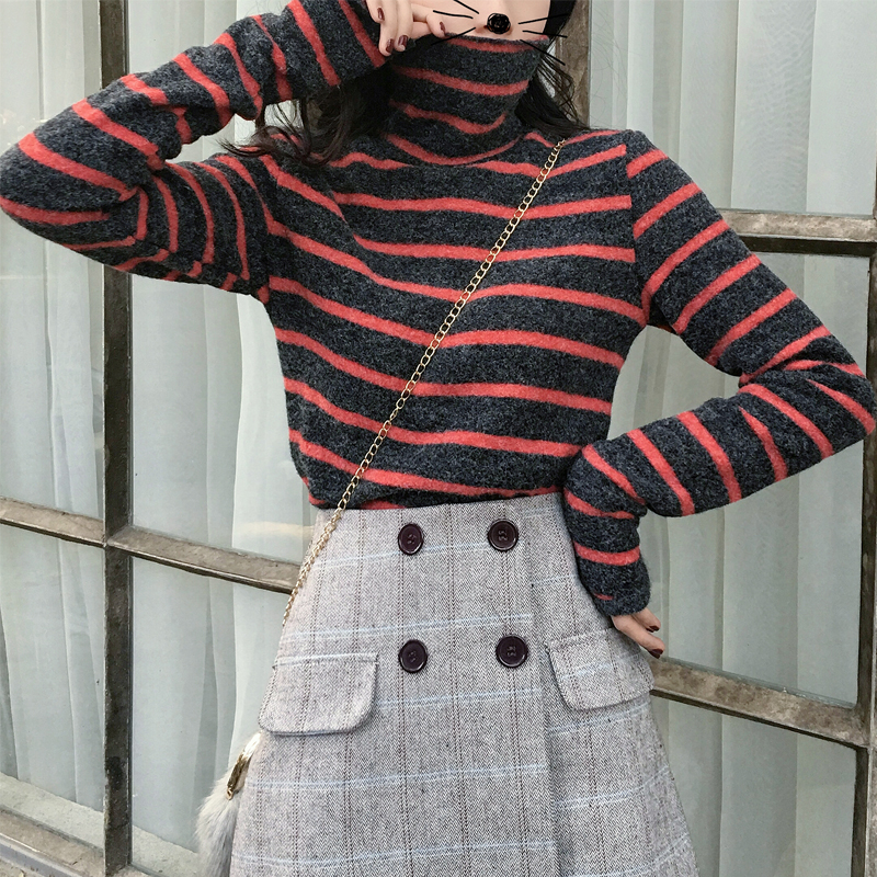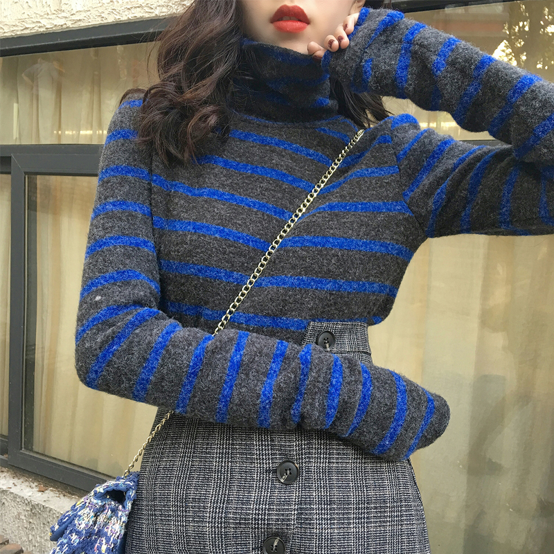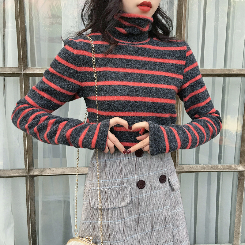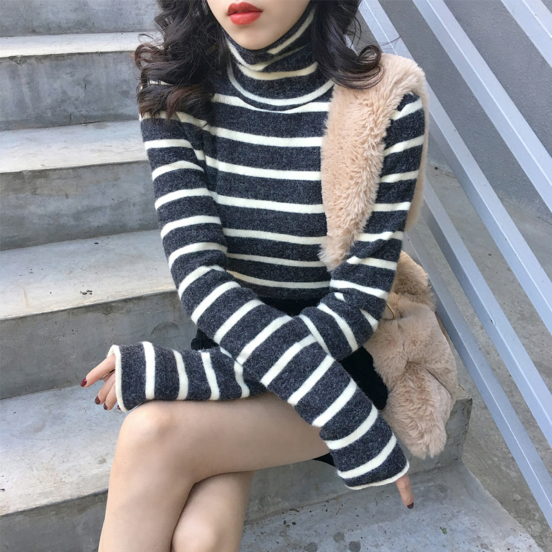 初秋上衣韓版修身顯瘦百搭長袖打底衫女T恤兔絨條紋高領打底tee潮