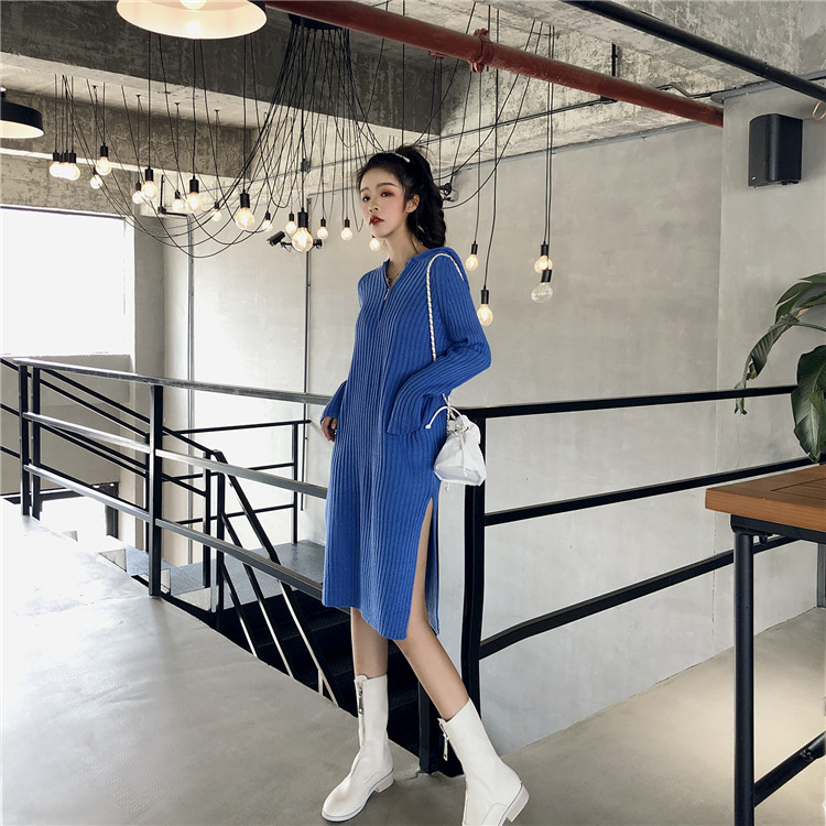 / 韓國chic風連帽針織衫坑條拉鏈長款網紅套頭毛衣連衣裙女2018新款
