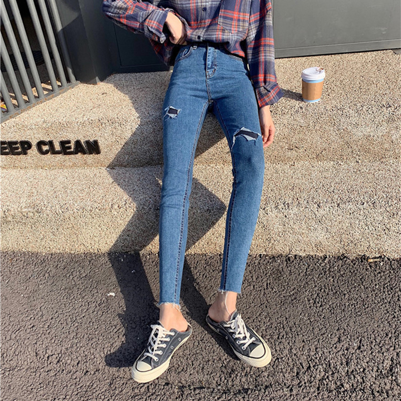 高腰顯瘦假破洞緊身牛仔褲女秋冬裝新款學生復古須邊九分鉛筆褲子
