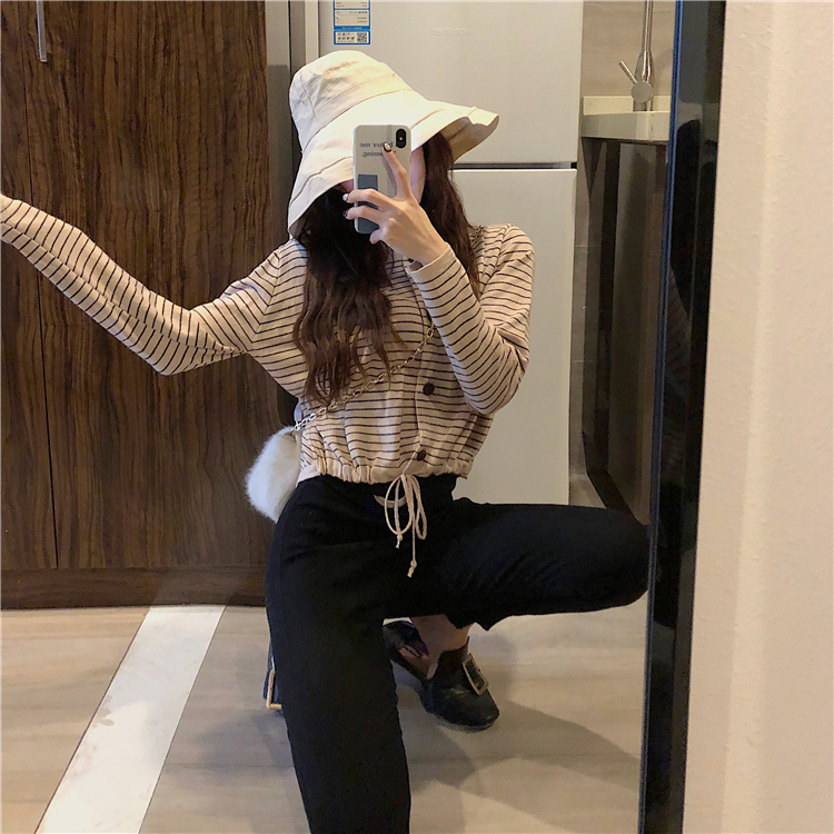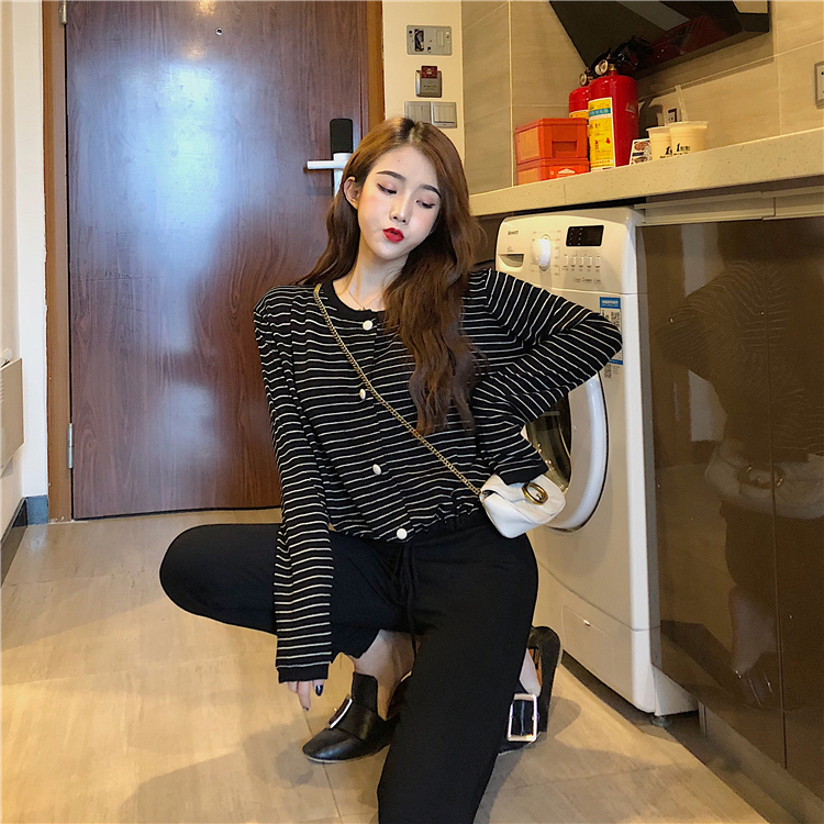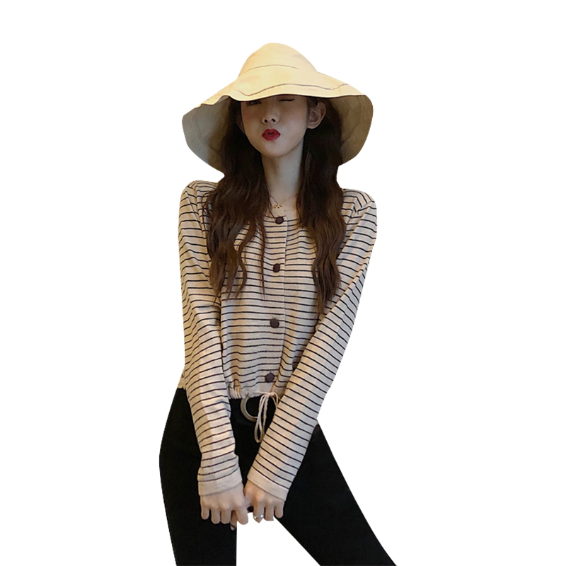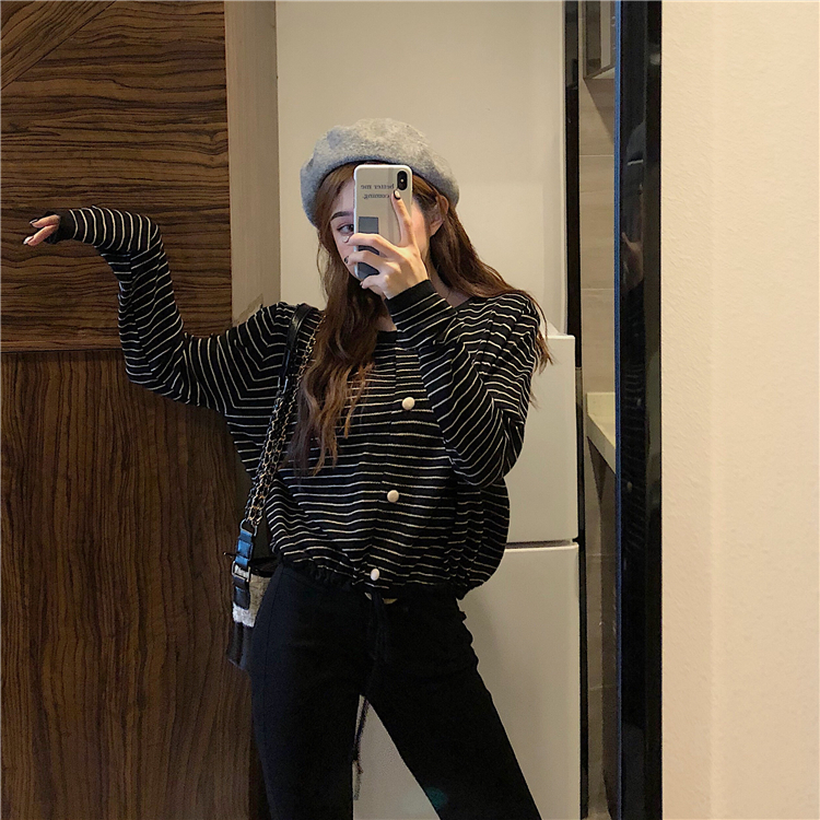 / 韓版秋季女裝新款chic長袖上衣寬松復古條紋針織衫開衫短款打底衫