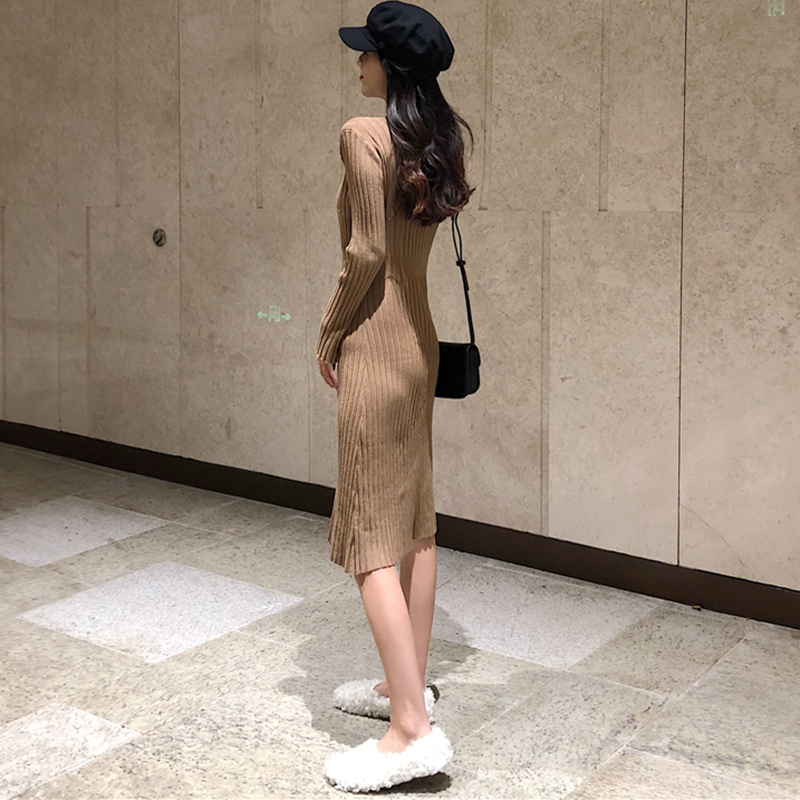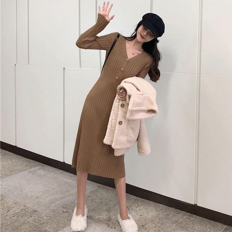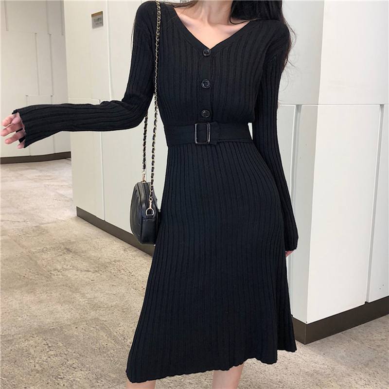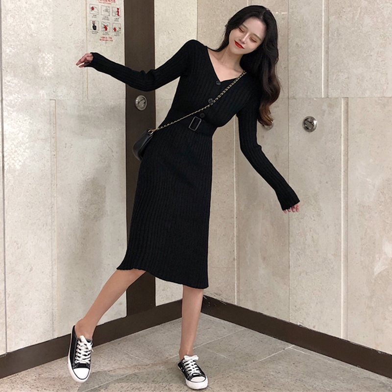 / 氣質V領修身顯瘦針織連衣裙子女秋冬裝新款法式桔梗裙egg風小黑裙