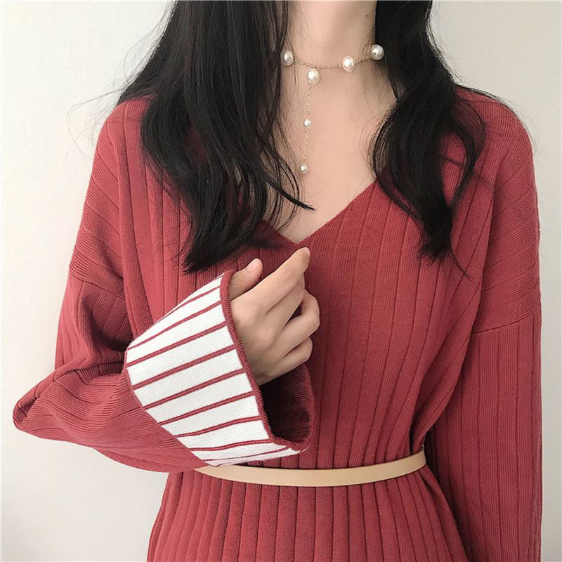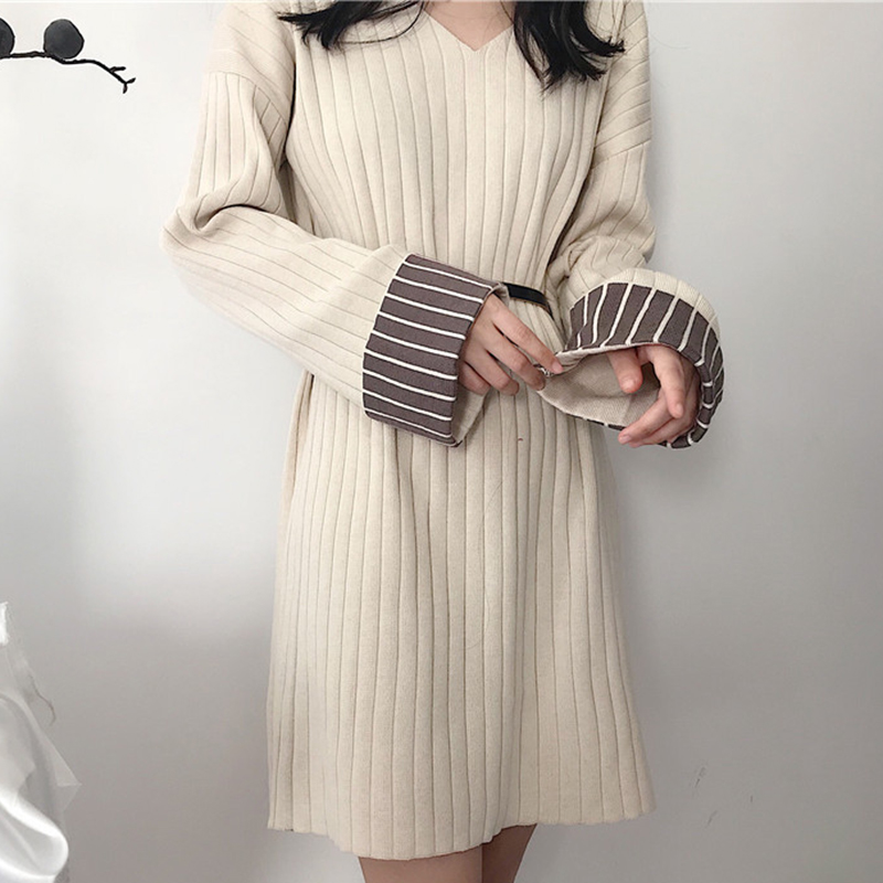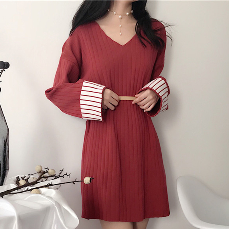 秋季女裝2018新款時尚休閑V領針織連衣裙洋氣溫柔撞色長袖A字裙子