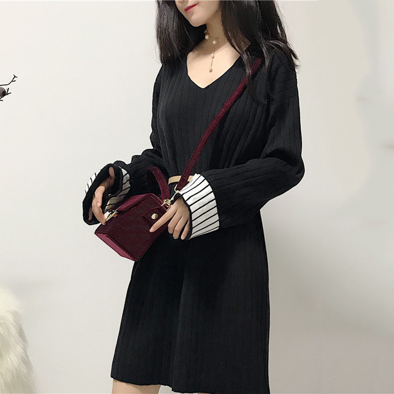 / 秋季女裝2018新款時尚休閑V領針織連衣裙洋氣溫柔撞色長袖A字裙子