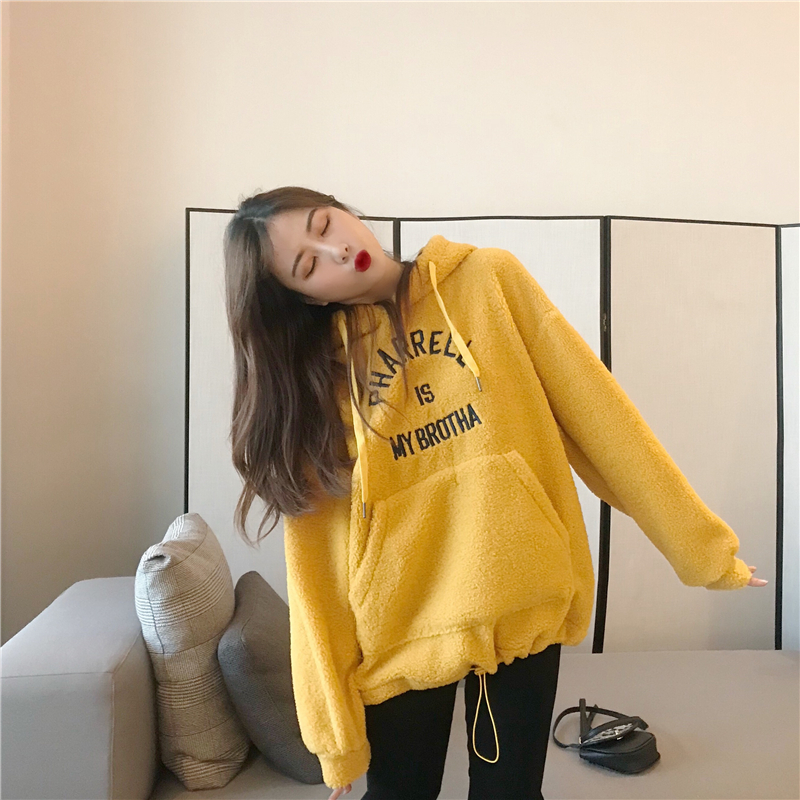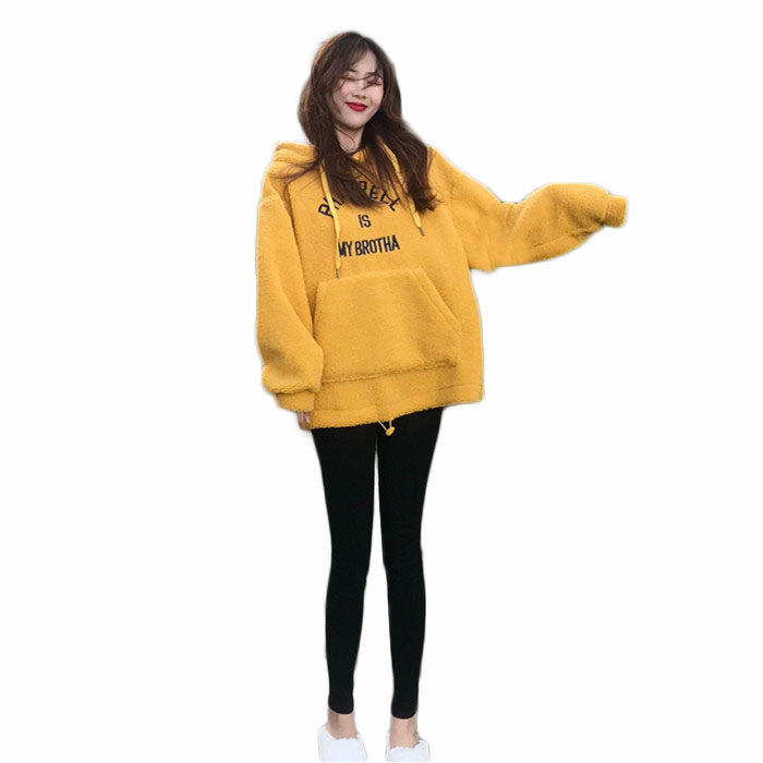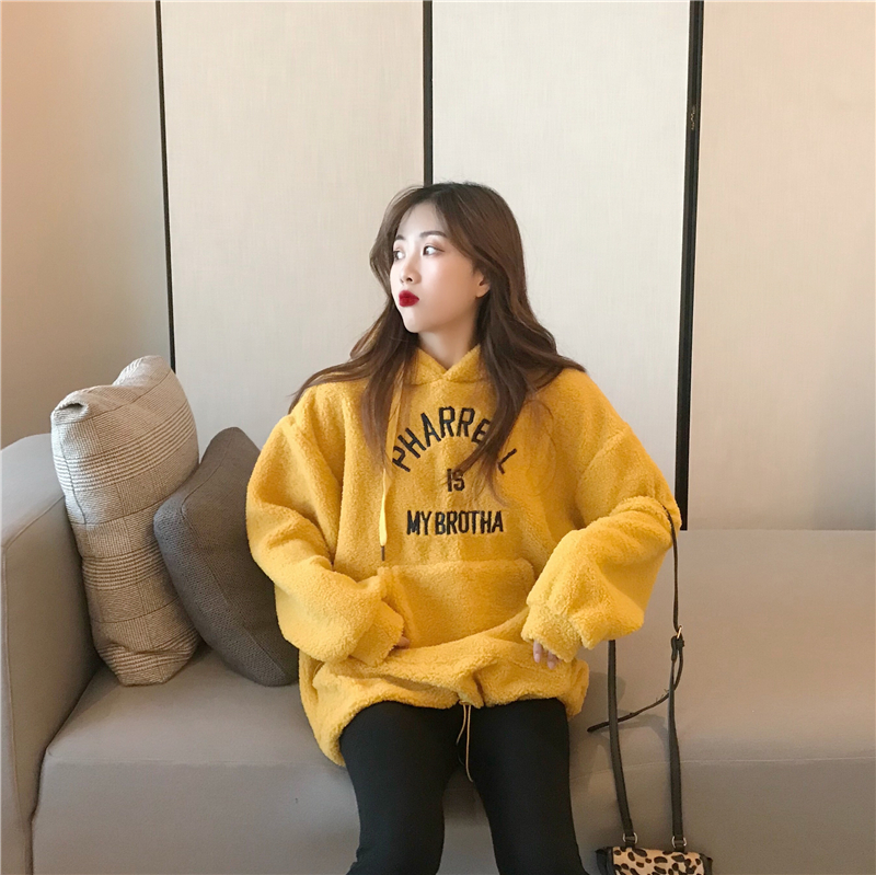 / 羊羔毛字母衛衣女秋冬2018新款氣質抽繩長袖韓版刺繡連帽套頭上衣